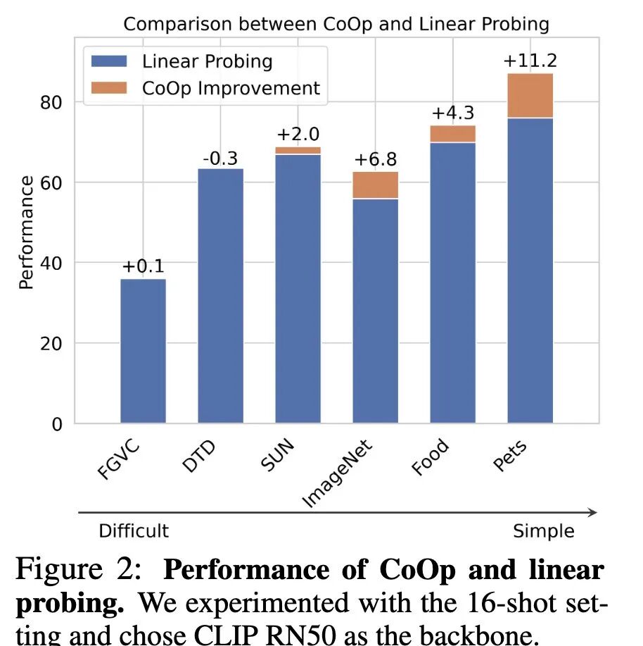 在本文中,我们发现:虽然 PEFT 方法在相对简单的数据集上表现良好,但在困难数据集上却难以泛化。例如,如图 2 所示,主流的 PEFT 方法 CoOp 在相对简单的数据集(如 OxfordPets)上相较于 LP 基线能取得显著提升;然而,在更具挑战性的数据集(如 FGVCAircraft)上,其提升却十分有限。