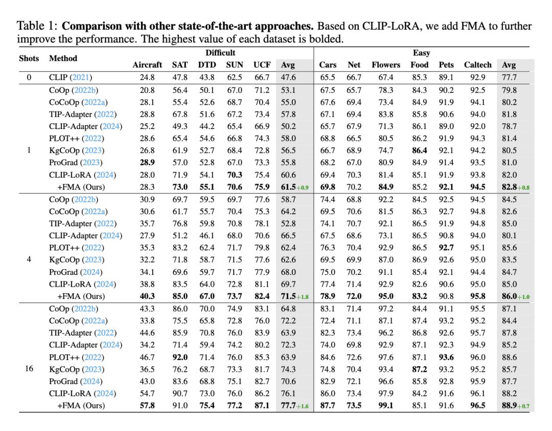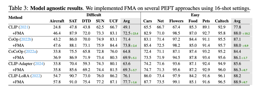 此外,FMA 可作为一个即插即用(plug-and-play)模块,用于多步校正。它仅需共享空间中的两组特征(图像与文本),且对图像或文本特征提取所采用的具体方法完全无关(model-agnostic)。因此,FMA 可轻松适配于不同方法,从零样本 CLIP 到各类 PEFT 方法均可无缝集成。