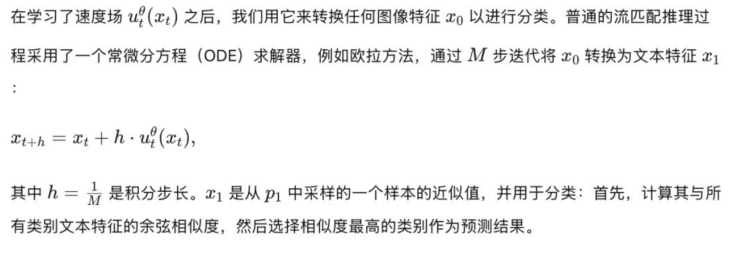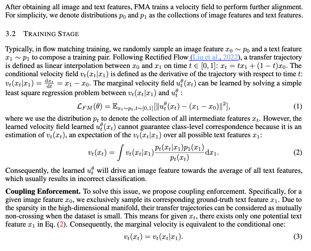 为解决这一问题,我们转向流匹配(Flow Matching, FM)理论(Liu 等,2022;Lipman 等,2022;Albergo & Vanden-Eijnden,2022),该理论专为在任意两个分布之间进行多步变换而提出。通常,FM 通过学习一个速度场(velocity field),以迭代的方式将样本从源分布输运到目标分布——也就是说,即使单步调整不够准确,后续步骤仍有机会修正先前的误差。因此,如果能够训练一个速度场,将图像特征变换为对应的文本特征,我们就可以利用其多步校正能力实现更准确的分类。