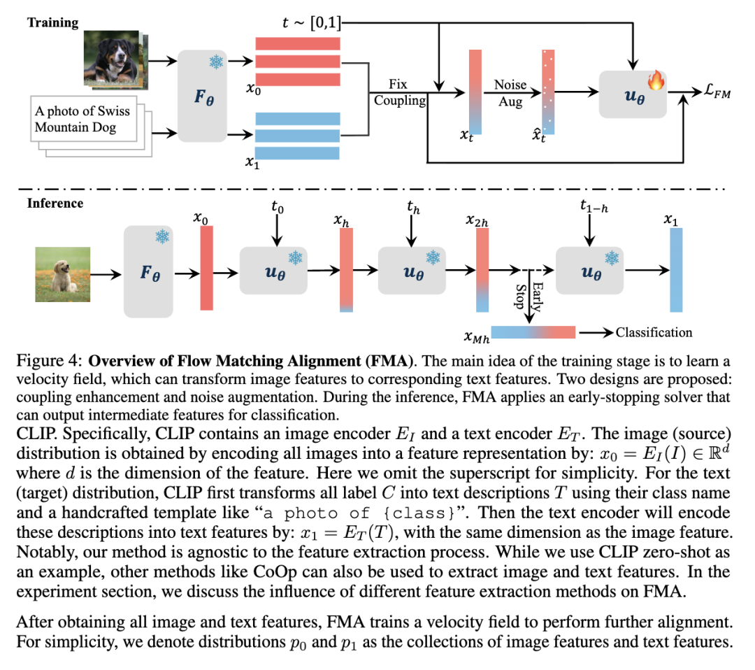 整体框架(General Framework)我们提出的 FMA 的整体流程如图 4 所示。具体而言,FMA 包含三个步骤:1)将所有文本和图像编码到共享的公共空间中,得到对应的特征;2)训练一个速度场,将图像特征变换为文本特征,以实现更好的对齐;3)利用训练好的速度场对给定测试图像的特征进行变换,用于分类。