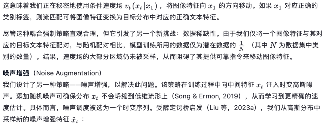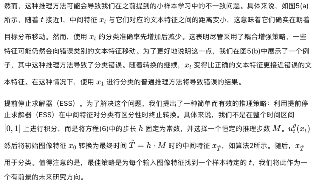 其次,在推理阶段,流匹配在生成任务中的目标是生成目标分布中的特征,然后将其解码为真实样本;但在分类任务中,我们真正需要的是将图像特征变换得比其他负类嵌入更接近其正类嵌入(即真实类别嵌入)。这种目标上的不一致表明,以往用于生成任务的流匹配推理策略可能并不适用于分类场景。因此,第二个挑战是:如何为分类任务设计一种合适的推理方法。