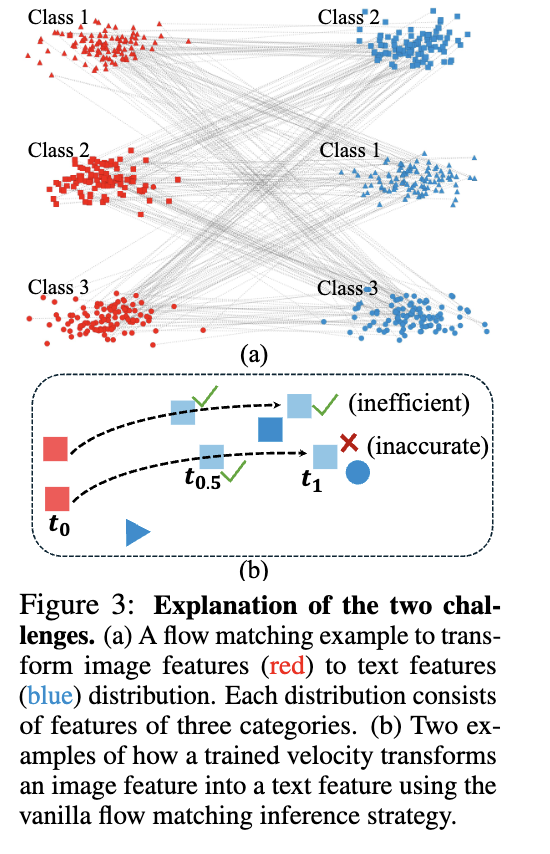 首先,尽管训练良好的速度场可以在两个给定分布之间实现变换,但它无法保证保留局部结构(例如类别对应关系)。例如,如图 3(a) 所示,它可能将某一类别的图像特征变换为另一类别的文本特征,从而导致错误分类。因此,第一个挑战在于:如何训练一个速度场,使其不仅能将图像特征从源分布变换到目标分布(靠近文本特征)。