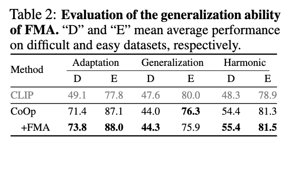 结果(Results)结果如表 2 所示。FMA 在提升少样本学习性能(前两列)的同时,并未进一步损害泛化能力(中间两列)。同时,调和平均值的提升表明,FMA 在适应能力与泛化能力之间取得了更好的平衡。