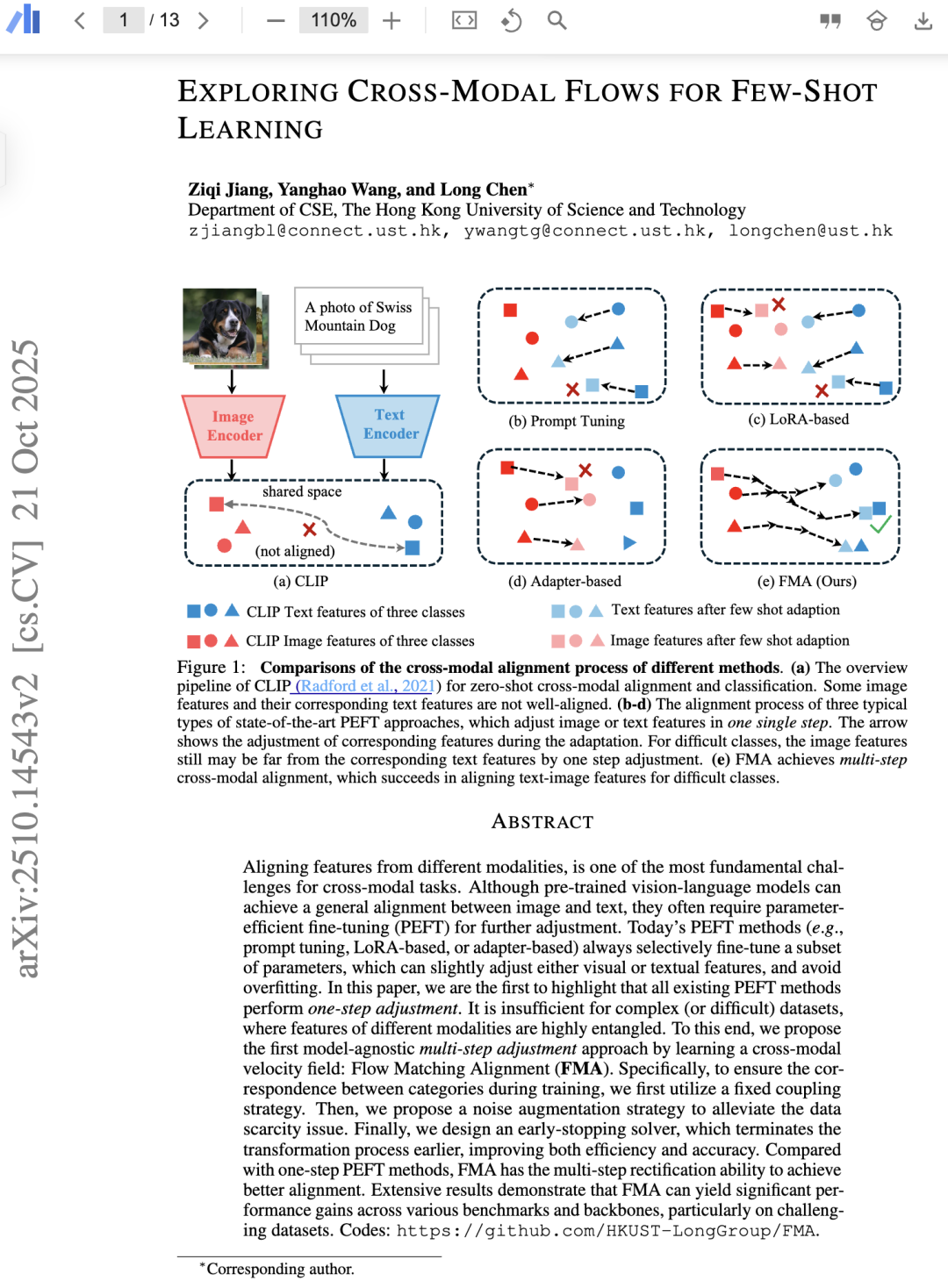 对齐不同模态的特征是跨模态任务中最基本的挑战之一。尽管预训练的视觉-语言模型能够在图像和文本之间实现通用对齐,但它们通常需要参数高效微调(PEFT)以进一步调整。当前的PEFT方法(例如,提示调优、基于LoRA的方法或基于适配器的方法)总是选择性地微调一部分参数,从而仅能轻微调整视觉或文本特征,并避免过拟合。本文首次指出,所有现有的PEFT方法都仅执行单步调整。对于复杂(或困难)的数据集而言,这种单步调整是不够的,因为在这些数据集中不同模态的特征高度纠缠。为此,我们提出了首个与模型无关的多步调整方法——通过学习一个跨模态速度场:流匹配对齐(Flow Matching Alignment, FMA)。具体而言,为确保训练过程中类别之间的对应关系,我们首先采用一种固定的耦合策略;随后,我们提出一种噪声增强策略以缓解数据稀缺问题;最后,我们设计了一种早停求解器,在变换过程早期终止,从而同时提升效率与准确性。与单步PEFT方法相比,FMA具备多步校正能力,可实现更优的对齐效果。大量实验结果表明,FMA在各种基准和骨干网络上均能带来显著的性能提升,尤其在具有挑战性的数据集上表现突出。代码: