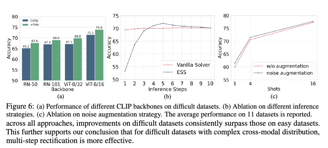 结果(Results)我们在表 1 中报告了所有方法在 11 个数据集上的分类准确率。对于每个数据集,我们分别报告了 1 样本、4 样本和 16 样本分类的结果。结果表明,FMA 在大多数数据集上取得了最佳性能。值得注意的是,与简单数据集相比,FMA 在困难数据集上展现出更显著的优势。这验证了我们之前的结论:当跨模态分布复杂、难以对齐时,多步校正至关重要。