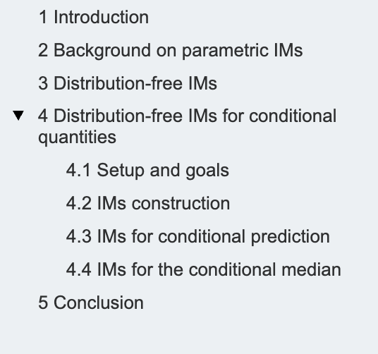 本文其余部分组织如下。在第 2 节,提供了关于参数化 IMs 的简要背景,以使读者了解 IMs 背后的基本推理、其构造逻辑以及它们满足的关键性质。第 3 节介绍了(无条件的)无分布假设 IMs,其中 Cella [5] 的发展(最初设计用于固定的关注量)被推广以同时容纳固定和随机量。这种推广很重要,因为第 4 节中提出的用于条件量的 IMs 遵循类似的逻辑。最后,第 5 节提供了一个简明的总结、关键评论以及对开放问题的讨论。