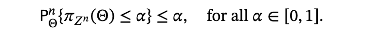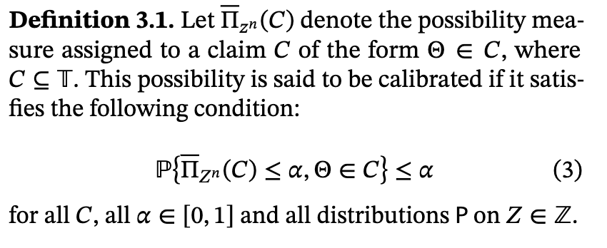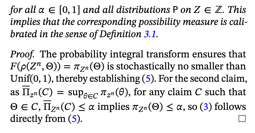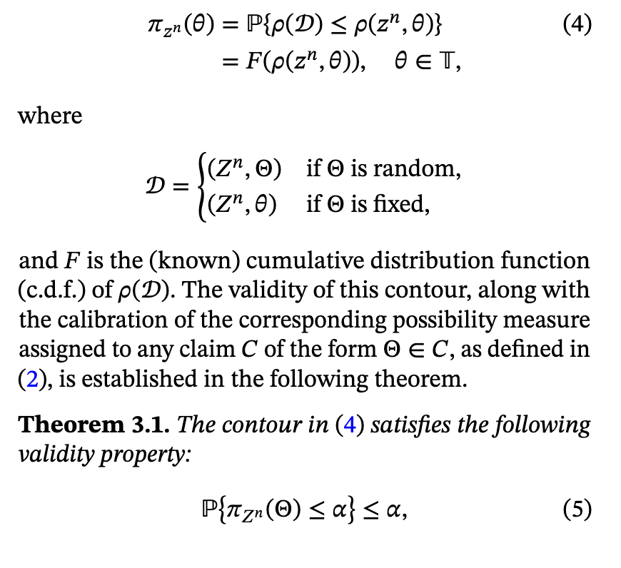 换句话说,推断模型(IMs)将小的可能性(≤ α)赋予真实断言的频率(作为数据 𝑍ⁿ 的函数)也很小(≤ α)。 对于 IM 的必然性测度,也有相应的陈述,但我们在本文此处及后续部分均省略。关于这两种测度在 IM 框架中各自所起的重要作用的讨论,参见 Cella 和 Martin [11]。 这些校准性质的基础是 IM 轮廓函数(contour)所谓的有效性(validity)性质,其形式如下: