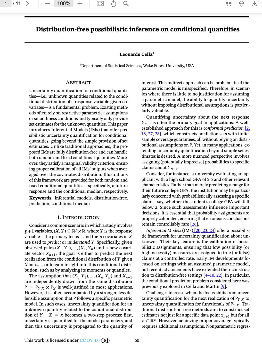 摘要 对条件量(即与给定协变量下响应变量的条件分布相关的未知量)进行不确定性量化是一个基本问题。现有方法通常依赖于严格的参数假设或光滑性条件,并且通常仅提供未知量的集合估计。本文引入了推断模型(Inferential Models, IMs),用于对条件量进行可能性(possibilistic)不确定性量化,超越了仅提供集合估计的简单做法。与传统方法不同,所提出的 IMs 完全无需分布假设(distribution-free),并能同时处理随机和固定的条件量。此外,它们满足一种边缘有效性(marginal validity)准则,确保在对协变量分布取平均时,所有 IM 输出均得到恰当校准。本文通过实例展示了该框架在随机和固定条件量上的应用——具体而言,分别针对一个未来响应值和条件中位数。