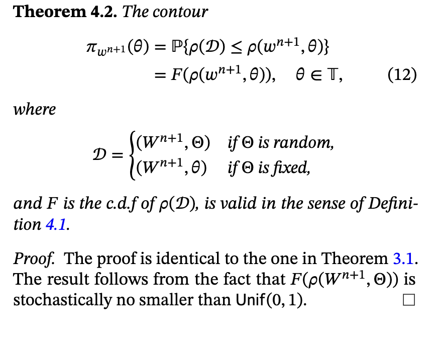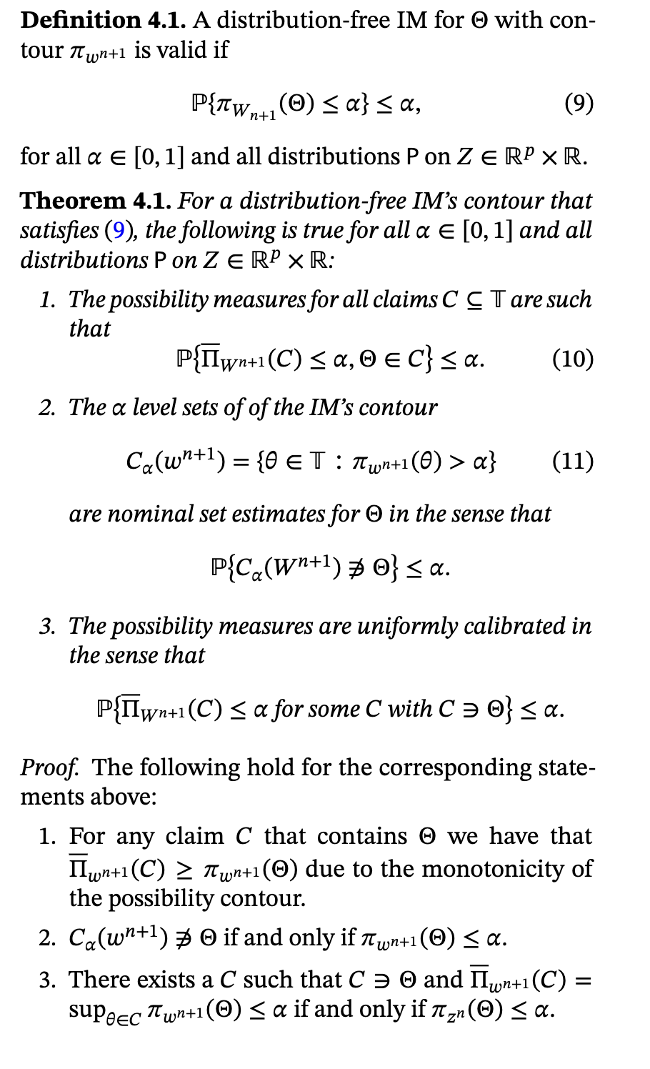 为了为这些与条件分布相关的 Θ 构建一个 IM,我们首先需要明确我们希望达成的有效性类型。观测数据由 𝑍ⁿ 中的 n 个协变量-响应配对以及第 (n+1) 个协变量向量 𝑋ₙ₊₁ 组成。我们将此组合数据记为 𝑊ₙ₊₁,即 𝑊ₙ₊₁ = {𝑍ⁿ, 𝑋ₙ₊₁}。以下定义指定了基于 𝑊ₙ₊₁ = 𝑤ₙ₊₁ 的针对 Θ 的无分布假设 IM 的轮廓函数应满足的理想有效性,而后续定理则概述了具有此类轮廓函数的 IM 所具备的性质。在本节中,当 Θ 是固定时,ℙ 表示对 𝑊ₙ₊₁ 取的概率;当 Θ 是随机时,ℙ 表示对 𝑊ₙ₊₁ 和 Θ 两者取的概率。