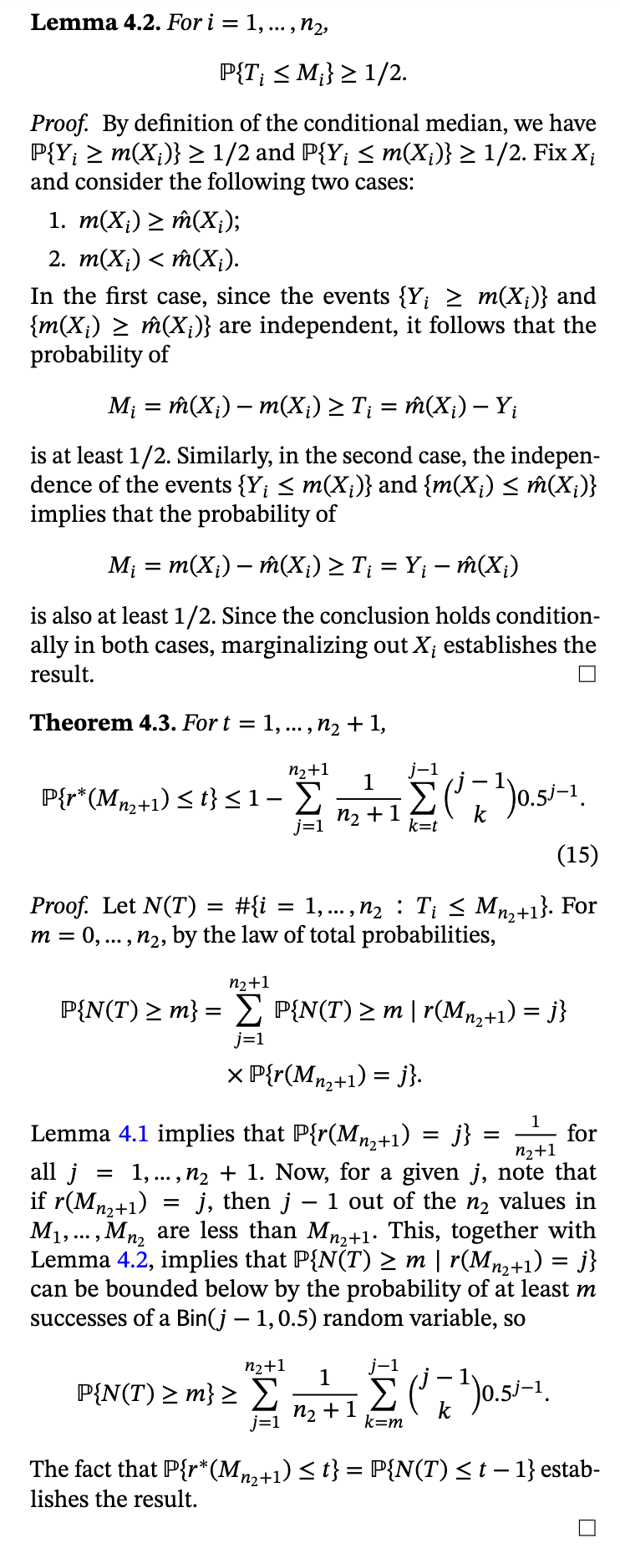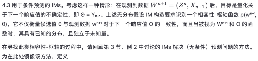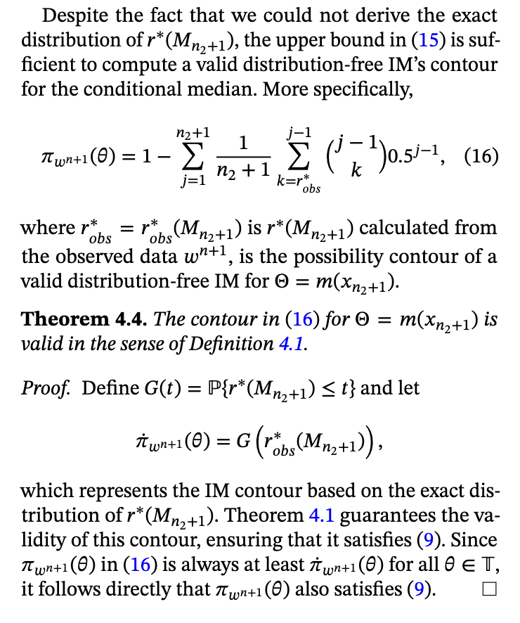4.4 用于条件中位数的 IMs。我们现在将焦点转移到一个固定的 Θ,具体而言即条件中位数。记 m(x) 为给定 X = x 时 Y 的条件分布的中位数。在给定观测数据 wⁿ⁺¹ 的情况下,目标是为 Θ = m(xₙ₊₁) 构建一个无分布假设的 IM。