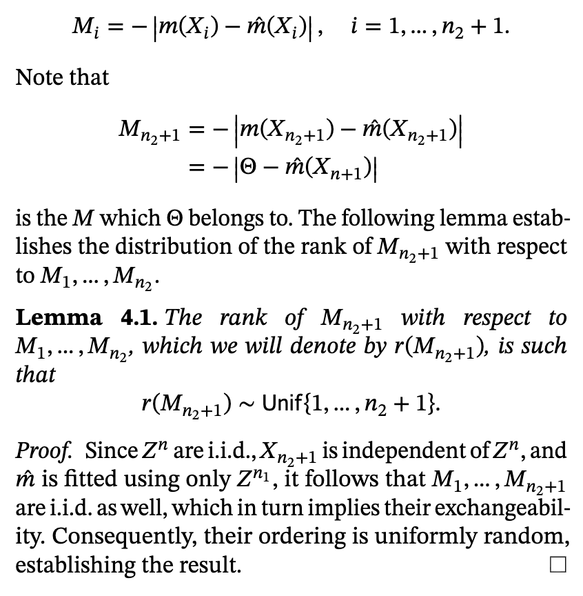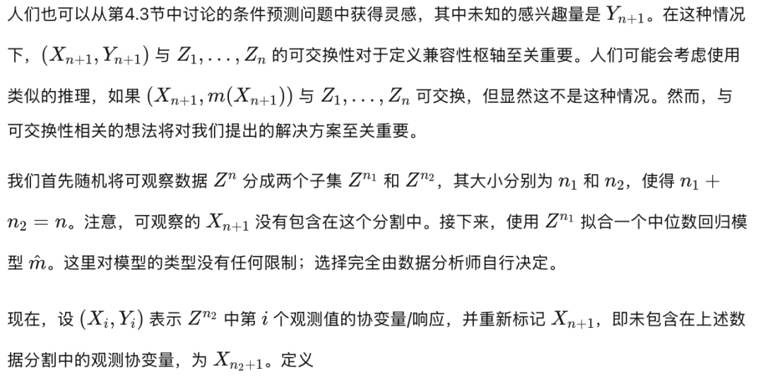 4.1 设置与目标。在本节中,我们处理本文的核心问题:数据 𝑍ⁿ = (𝑍₁, ..., 𝑍ₙ) 由 𝑍 = (𝑋, 𝑌) ⊆ ℝᵖ × ℝ 的 n 个独立同分布实现构成,其中 𝑋 表示协变量,𝑌 表示定量响应变量。对 𝑍 的分布 𝖯 = 𝖯_Y|X × 𝖯_X 不做任何假设。关注点是一个与 𝖯_Y|X 相关的未知量 Θ。更具体地说,在观测到数据 𝑍ⁿ 和一个新的协变量向量 𝑋ₙ₊₁ 后,所关注的未知量与分布 𝑌 | 𝑋ₙ₊₁ = 𝑥ₙ₊₁ 相关。类似于第3节,Θ 可以是随机的(例如条件分布的下一个实现值 𝑌ₙ₊₁),也可以是固定的(例如其中位数)。
