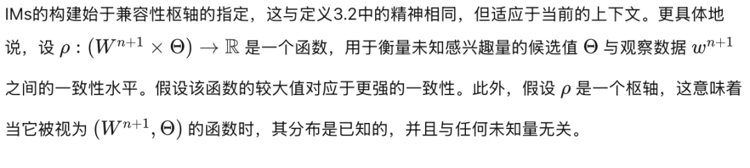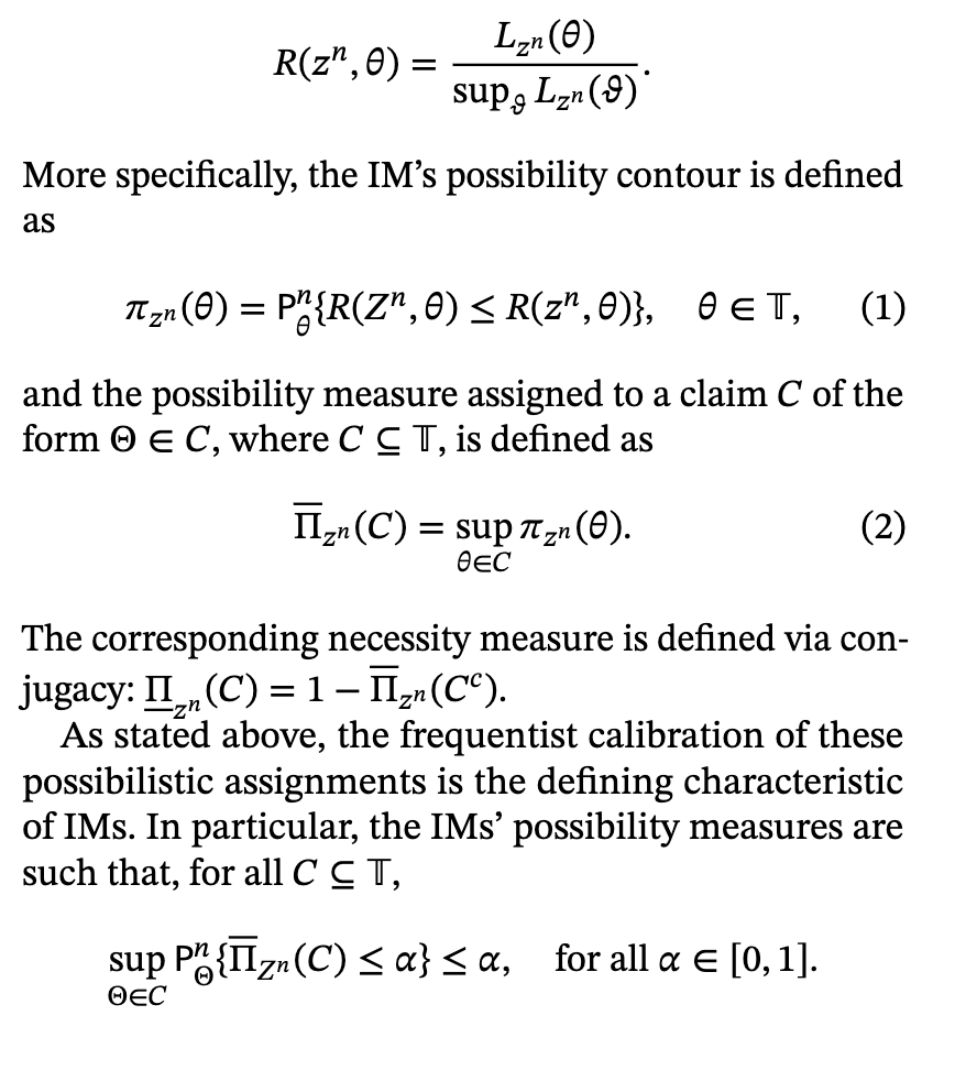 IM 构造背后的推理如下:相对似然自然地量化了未知参数 Θ 的某个候选值 𝜃 与观测数据 𝑧ⁿ 之间的相容性。然而,它本身并不能保证我们所追求的经过校准的概率性不确定性量化。为解决这一问题,相对似然需经过公式 (1) 中所述的“可能性到概率”的变换,Martin [21] 将该过程称为“有效化”(validification)。这种“相容性函数 + 有效化”的组合将在下文构建无分布假设的 IMs 中起到关键作用。