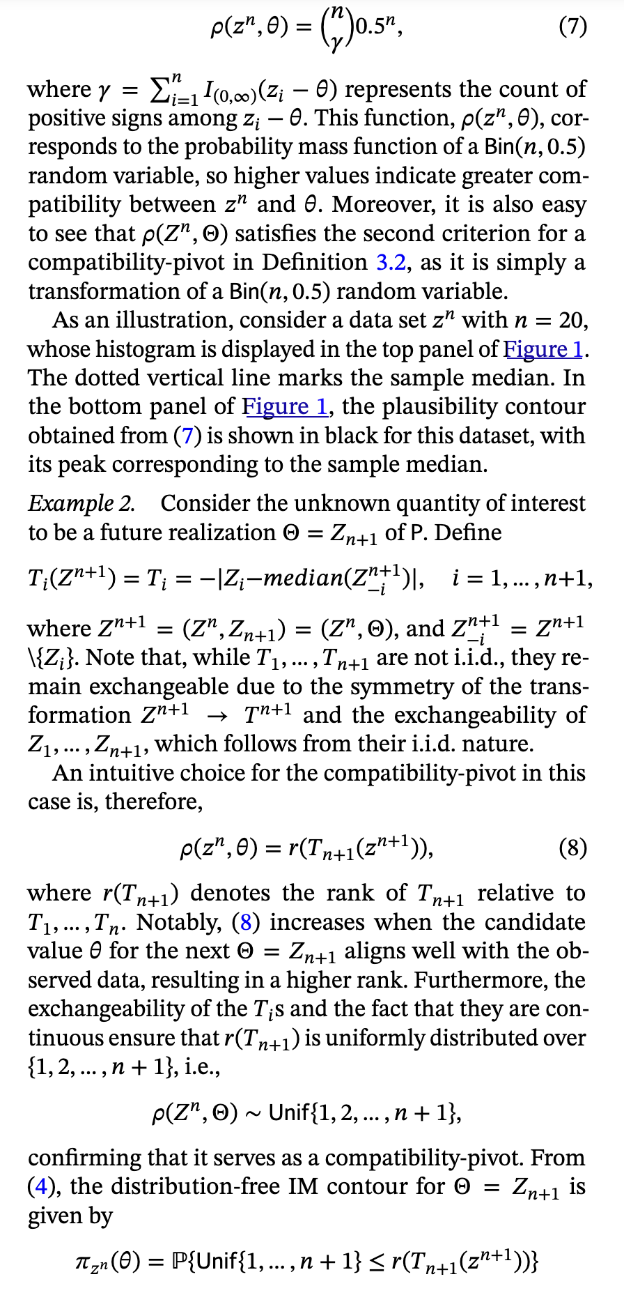 为了说明上述无分布假设 IM 的构造,我们考虑两个例子。在这两种情况下,Z₁, ..., Zₙ 均为独立同分布的连续定量变量。第一个例子考察一个固定的未知量 Θ,具体指 P 的中位数。第二个例子则关注一个随机的未知量 Θ,即 P 的下一个实现值 Zₙ₊₁。