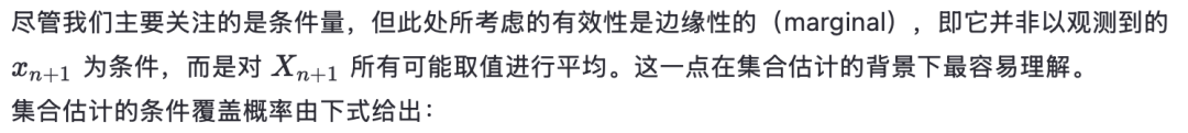 这就引出了一个问题:能否在不施加任何额外假设的情况下,实现对 P_Y|X 至少某些函数的有意义的不确定性量化?该领域的最新进展由 Medarametla 和 Candès [25] 以及 Barber [3] 做出,二者都专注于通过集合估计进行不确定性量化。这些发展的一个核心要素是他们采用的有效性概念。类似于共形预测,所提出的集合估计的覆盖范围被认为是边缘性的,而不是以特定的观测值 xₙ₊₁ 为条件。换句话说,目标是在以边缘分布 P_X 加权时覆盖未知关注量的值。由于未对 P 所属的分布类做任何假设,寻求针对单个数据点的校准集合估计比试图在整个 x ∈ ℝᵖ 上实现逐点覆盖更为可行 [25]。