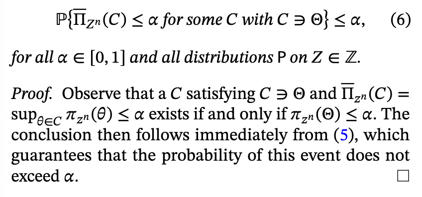 (6) 中的事件“存在某个满足 𝐶 ∋ Θ 的集合 𝐶”可被视为所有包含 Θ 的断言 𝐶 的并集。这显然比与任何一个固定的、包含 Θ 的集合 𝐶 相关的事件要宽泛得多,这意味着 (6) 中的概率界比 (3) 中相应的界更强。这种更强的校准概念确保了:即使数据分析人员没有遵循在数据收集之前预先设定感兴趣断言的推荐做法,而是让数据影响其对断言的选择,错误的结论仍然能被控制在罕见的范围内。