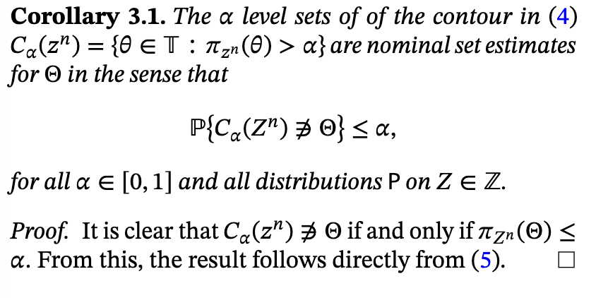 除了确保对所关注断言赋予的可能性测度具有校准性之外,(5) 还带来另外两个重要推论。首先,它意味着由 IM 轮廓函数导出的集合估计具有频率学派的错误率控制保证。