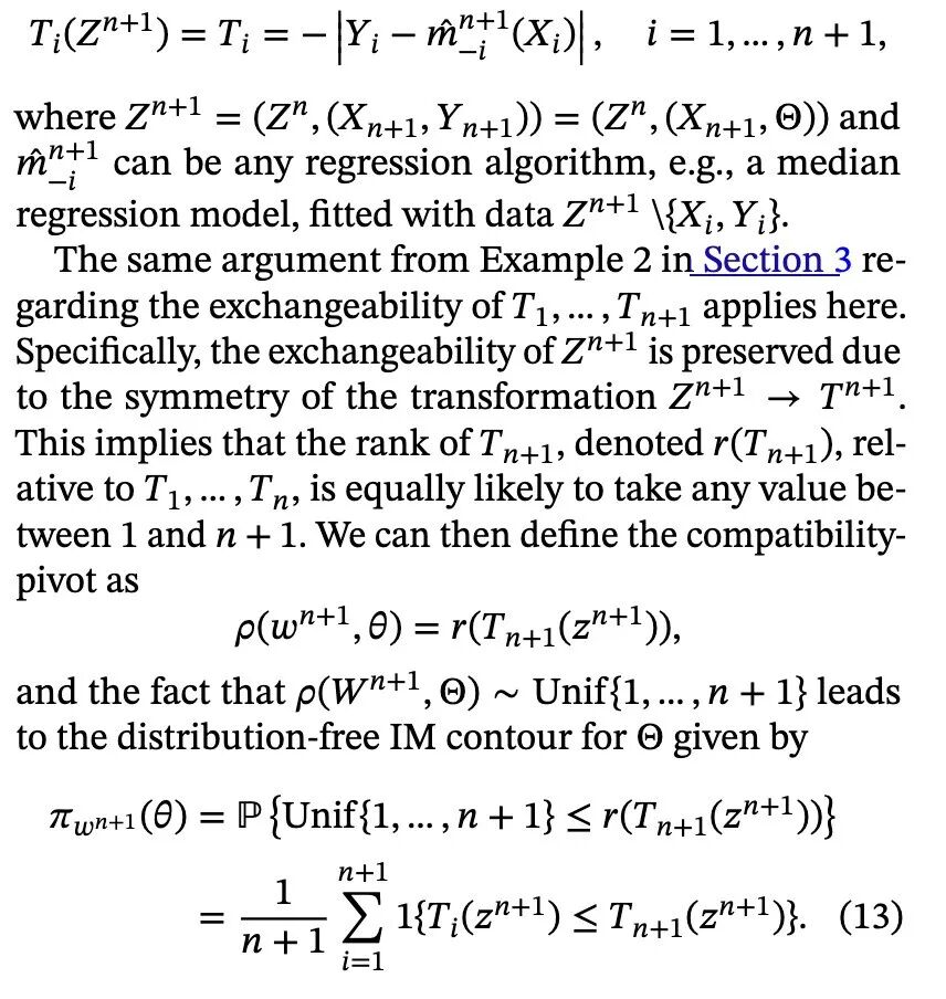 在构建针对 Θ 的无分布假设 IM 时,由于未假定模型,似然函数(以及相应的相对似然)不复存在。因此,无法通过公式 (1) 中的概率–可能性变换来获得轮廓函数(contour)。然而,我们认为第 2 节中提出的核心思想仍然适用:对一个实值函数进行“有效化”(validification),只要该函数能够度量 Θ 的候选值与观测数据 𝑧ⁿ 之间的相容性,就足以用于构建无分布假设的 IM。关键区别在于,在当前设定下,该相容性函数不能再基于相对似然,而需要一种新的策略。