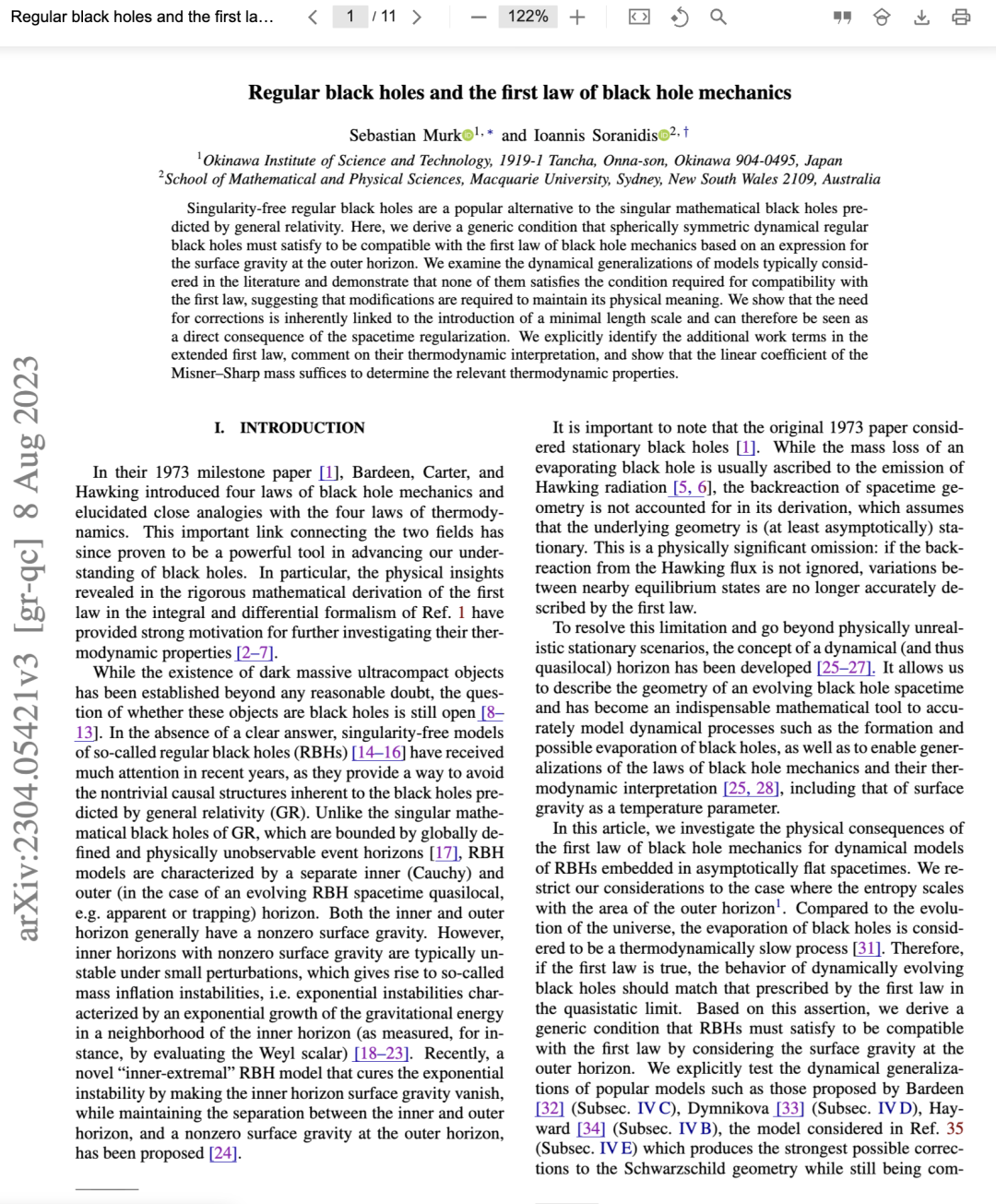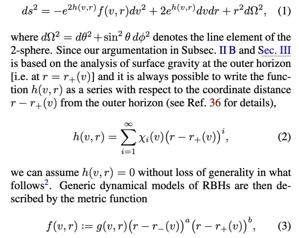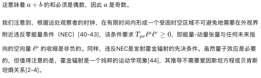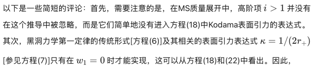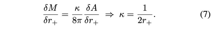需要注意的是,1973年的原始论文考虑的是静态黑洞[1]。尽管蒸发黑洞的质量损失通常被归因于霍金辐射的发射[5, 6],但在其推导中并未考虑时空几何的反作用,该推导假设底层几何是(至少在渐近意义上)静态的。这是一个物理上重要的遗漏:如果不能忽略霍金辐射的反作用,那么相邻平衡态之间的变化将不再能由第一定律准确描述。