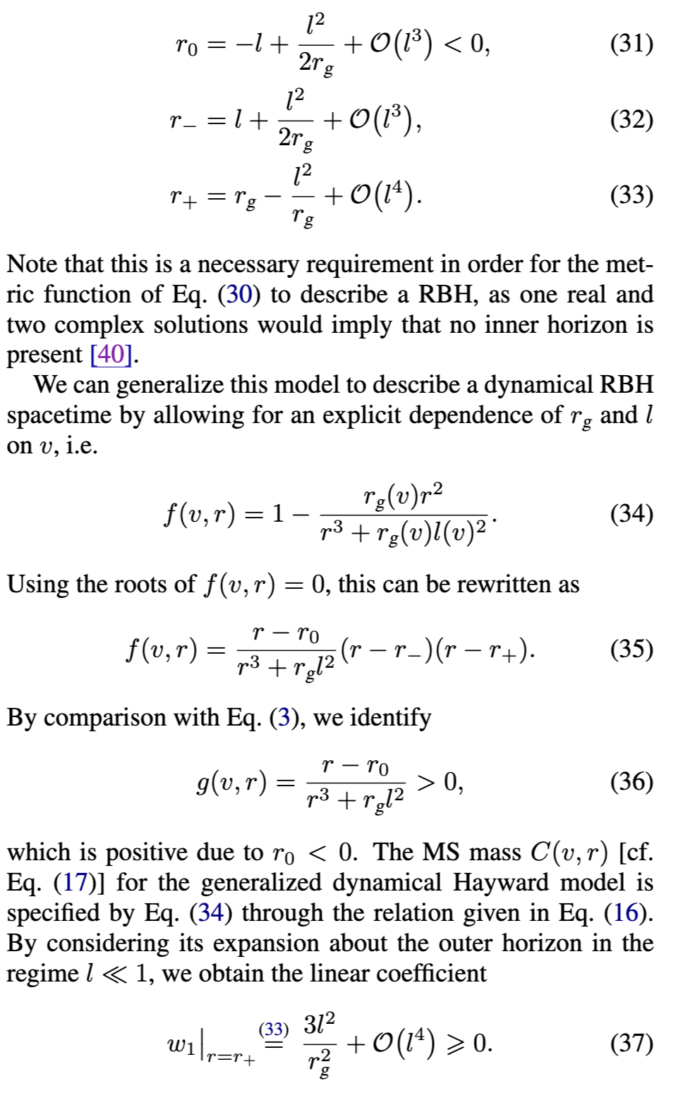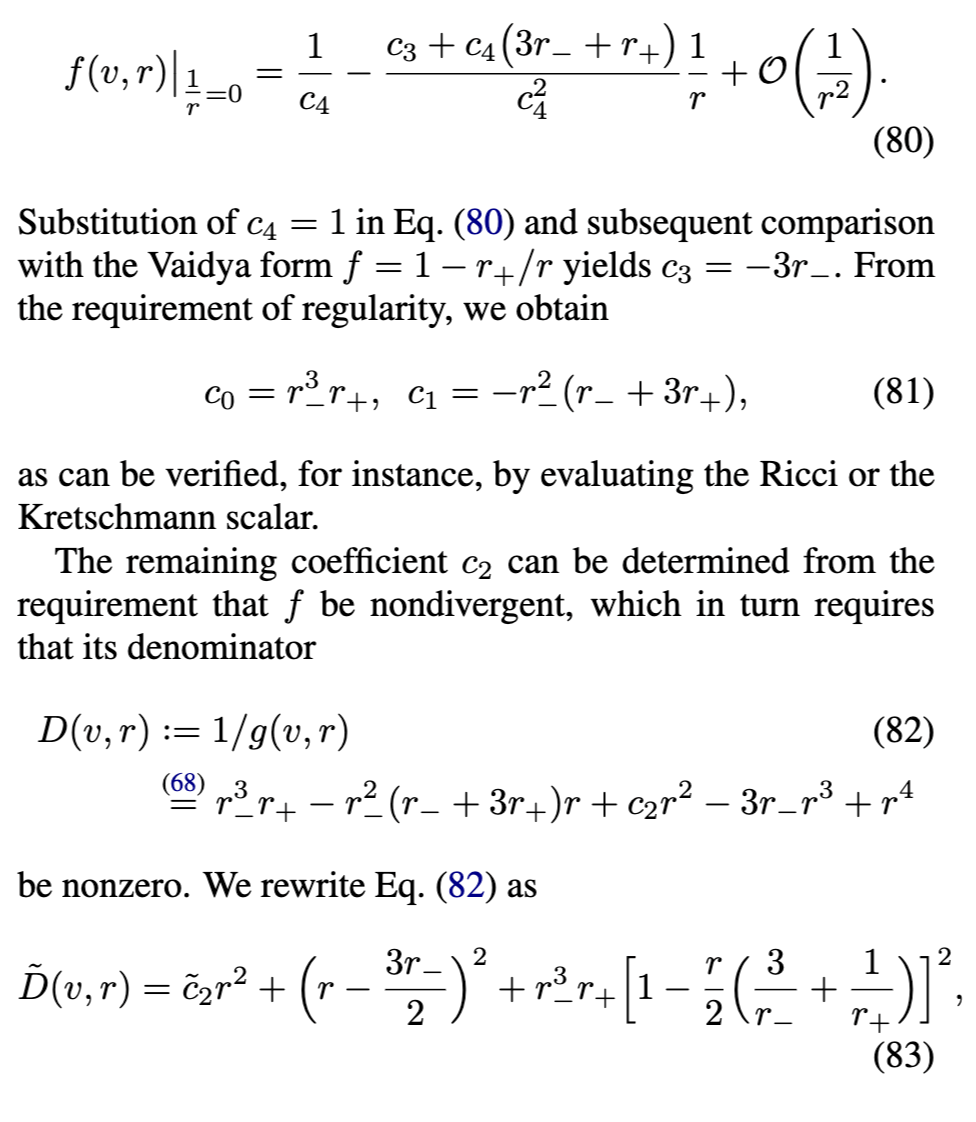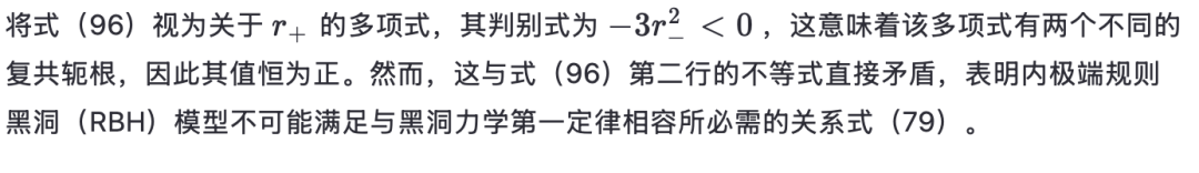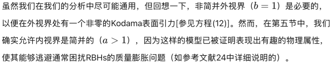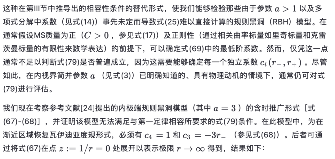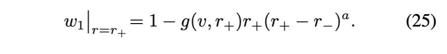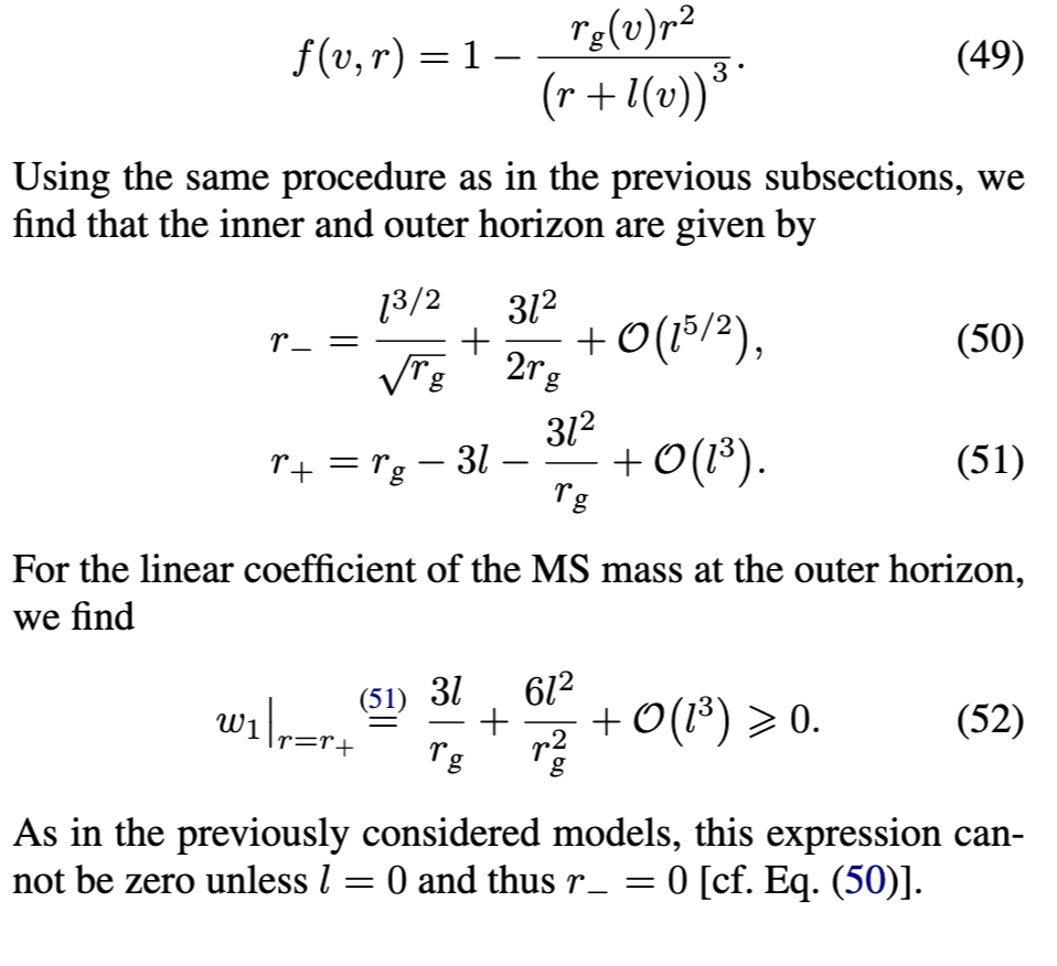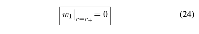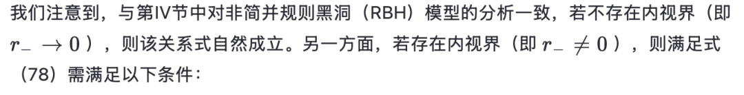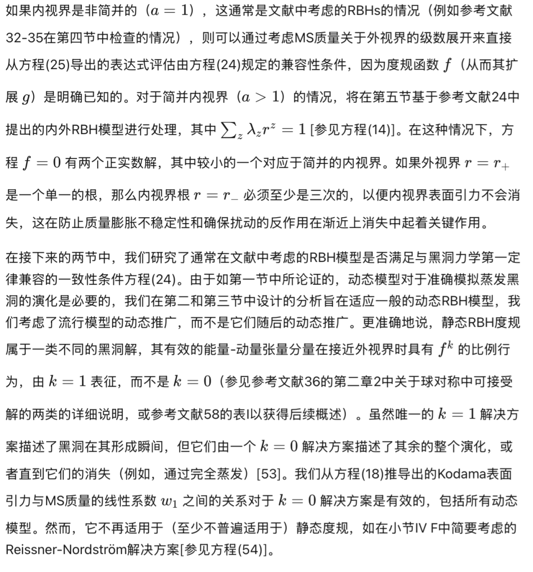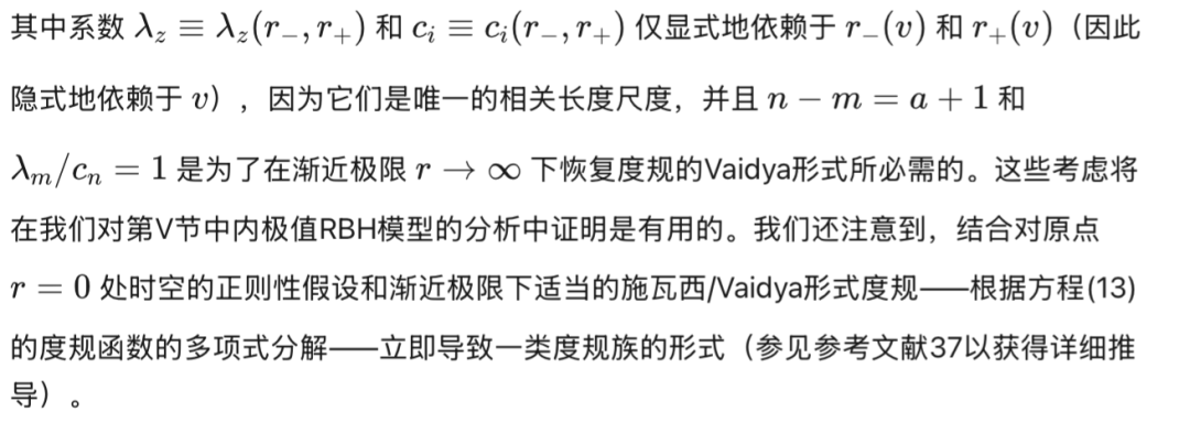 [参见方程(17)]在外视界必须消失。物理上,这意味着度规在外视界附近近似Vaidya解。第三,方程(18)-(24)中导出的表达式通常适用于由方程(16)形式的度规函数描述的黑洞。对于由方程(3)形式的度规函数描述的RBH,对方程(17)关于外视界进行级数展开得到