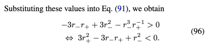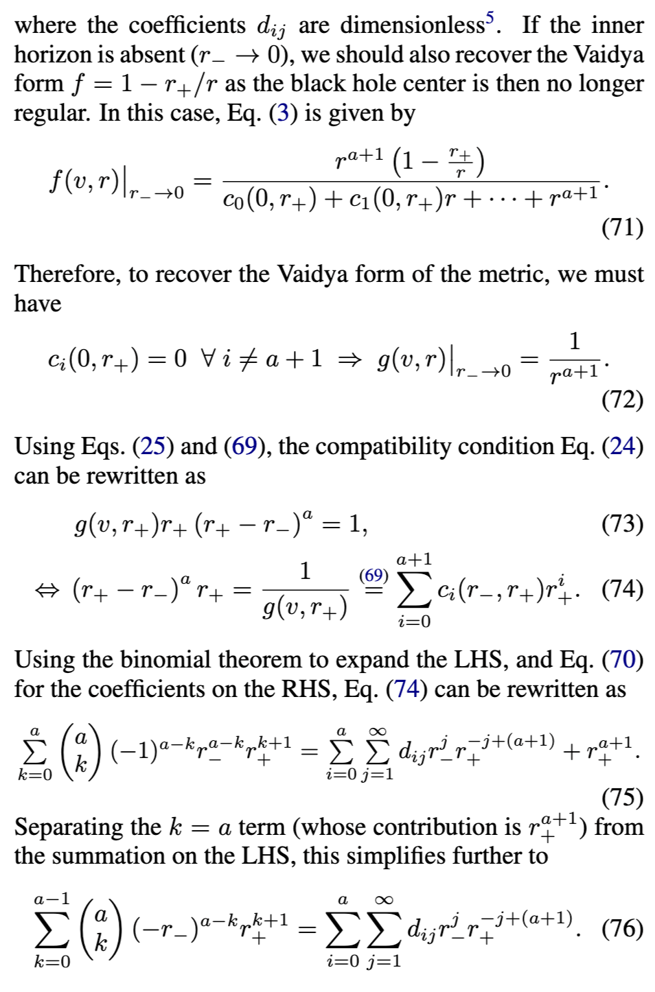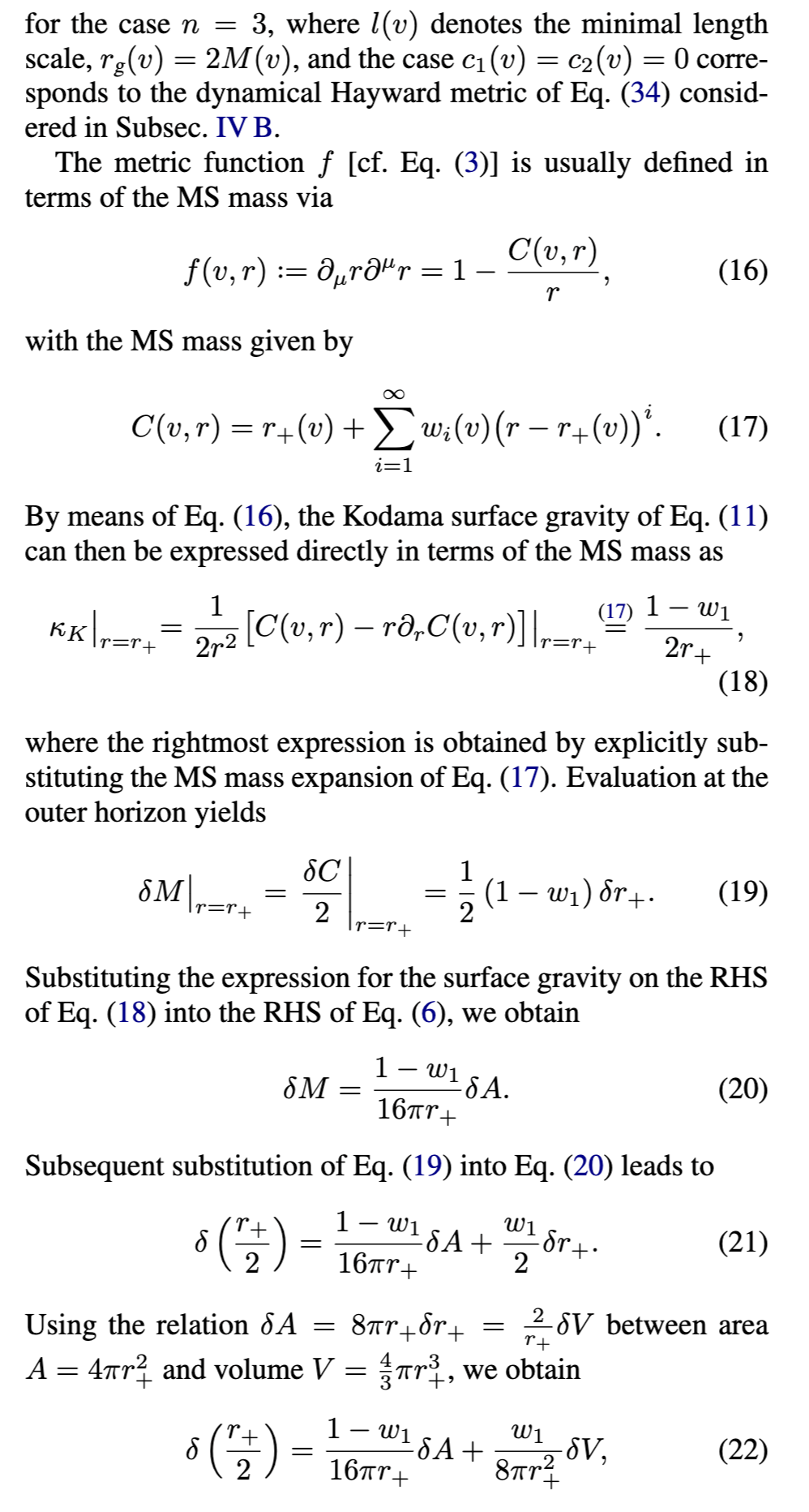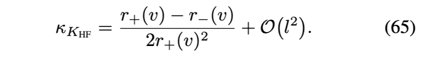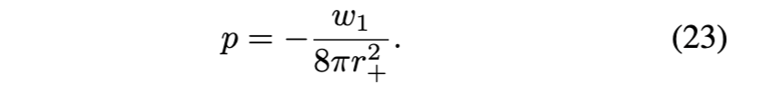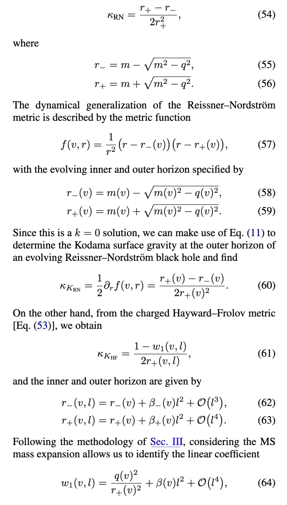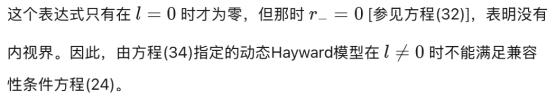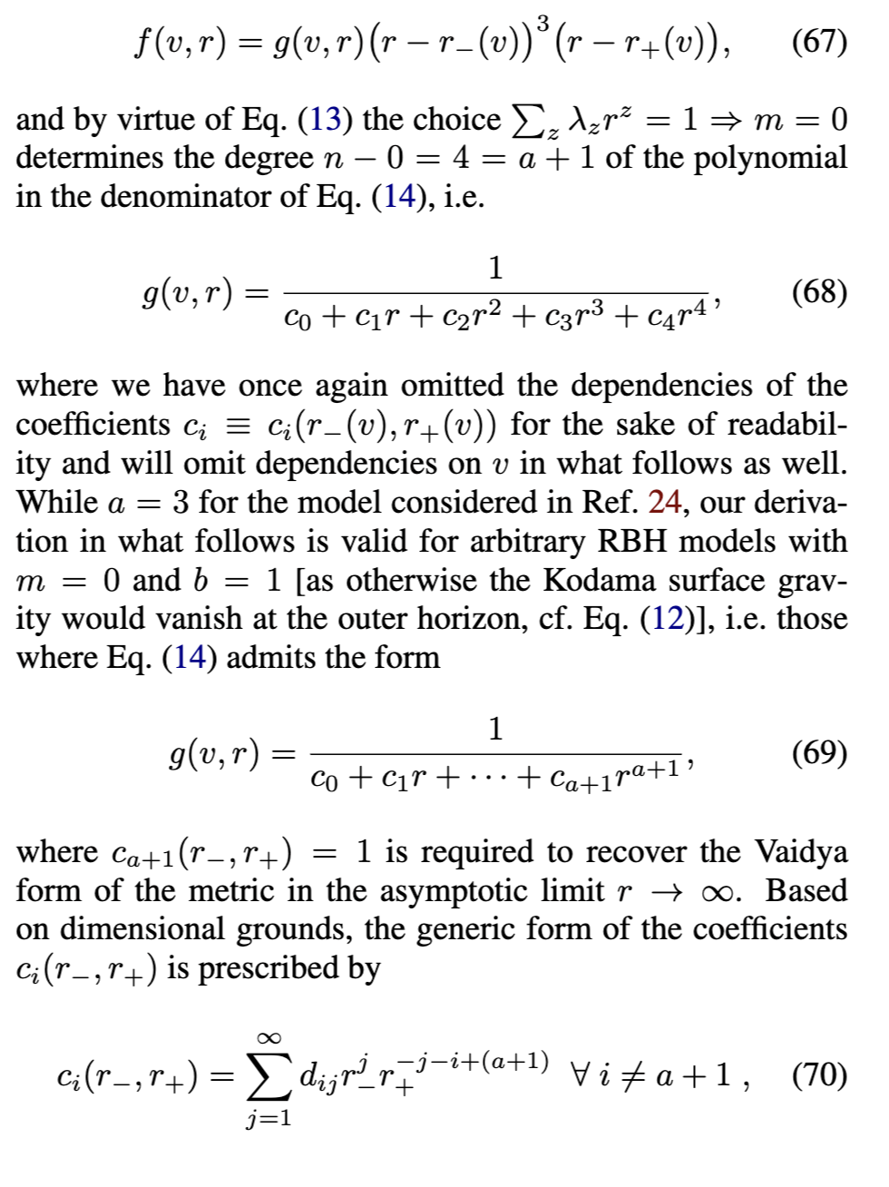 [参见方程(17)]在外视界必须消失。物理上,这意味着度规在外视界附近近似Vaidya解。第三,方程(18)-(24)中导出的表达式通常适用于由方程(16)形式的度规函数描述的黑洞。对于由方程(3)形式的度规函数描述的RBH,对方程(17)关于外视界进行级数展开得到
