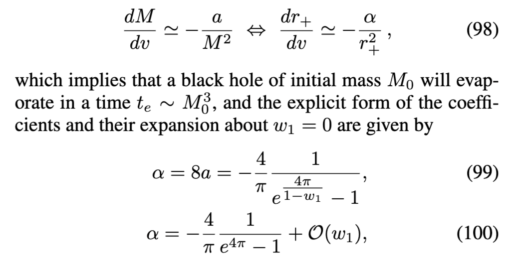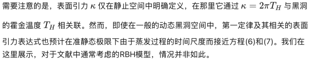 确实与第一定律规定的表面引力成正比——那么这种RBH的动态演化不能准确描述为标准的Page蒸发定律。人们可能会认为这是一个有些违反直觉的结果,考虑到方程(97)的推导是基于在渐近极限中感知到的霍金通量,因此人们会天真地期望引入的最小长度尺度(用于规范)不会影响结果。
