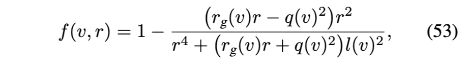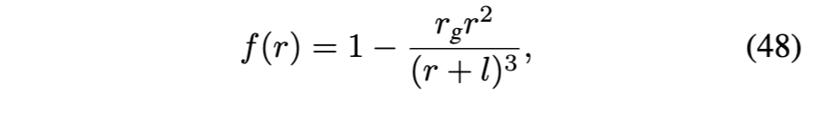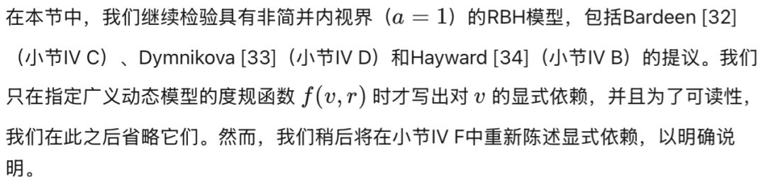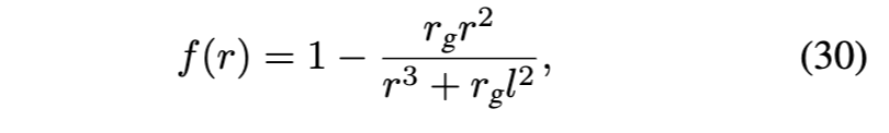 E. 具有最强施瓦西修正的正则黑洞模型 参考文献[35]中所研究的正则黑洞(RBH)模型,在仍保持与施瓦西几何渐近行为一致的前提下,展现出对施瓦西度规最强可能的修正。其度规函数为: