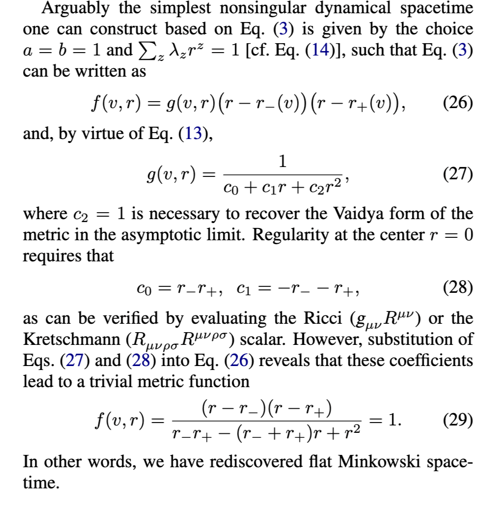 以最保守的形式,我们的分析结论可以表述如下:非奇异黑洞与基于参考文献1和5-7结果的广泛接受的半经典描述蒸发黑洞不兼容。除非人们愿意放弃规则性和物理上行为良好的内部(一直到中心)或黑洞力学第一定律(及其相关的表面引力作为有效温度的热力学解释)的想法,否则我们的结果表明,即使在半经典引力的层面上也需要修改第一定律。