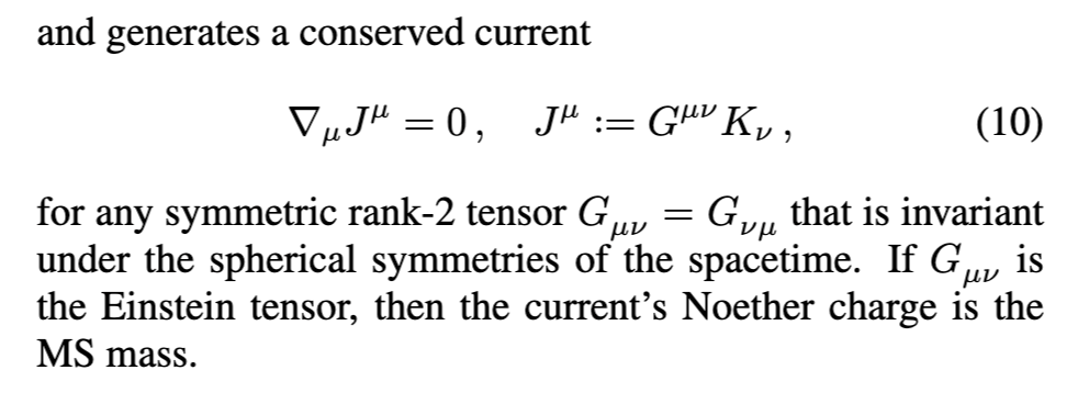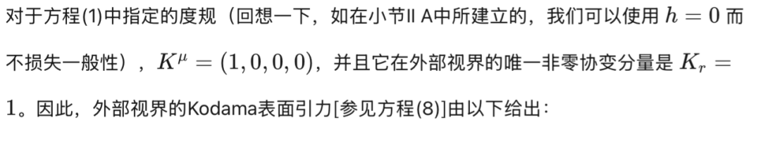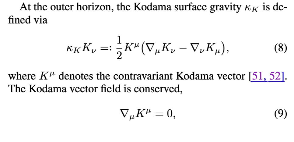 推广表面引力到演化中的黑洞空间的主要困难在于,与它们的静止对应物不同,它们不能保证存在一个生成定义表面引力所需的零超曲面(称为Killing视界)的时间类Killing向量场。然而,即使在非静止的球对称空间中,也可以在(准局部的)外视界使用Kodama向量场定义动态表面引力[51, 52],在某种意义上超越了Killing向量场的概念。