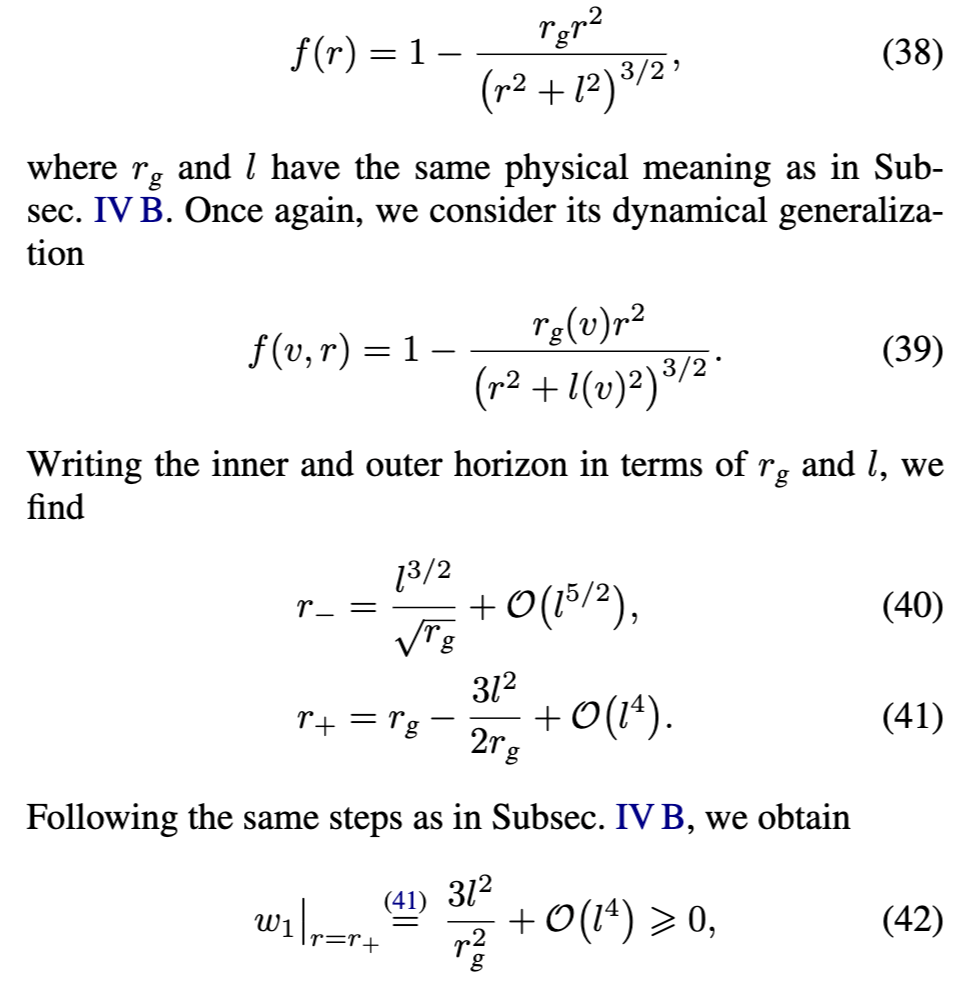 F. 带电的海沃德–弗罗洛夫模型 在文献[37]中,弗罗洛夫(Frolov)提出了对海沃德模型的推广,使其包含电荷 q。在推广至含时情形后,此类正则黑洞(RBH)的度规函数为: