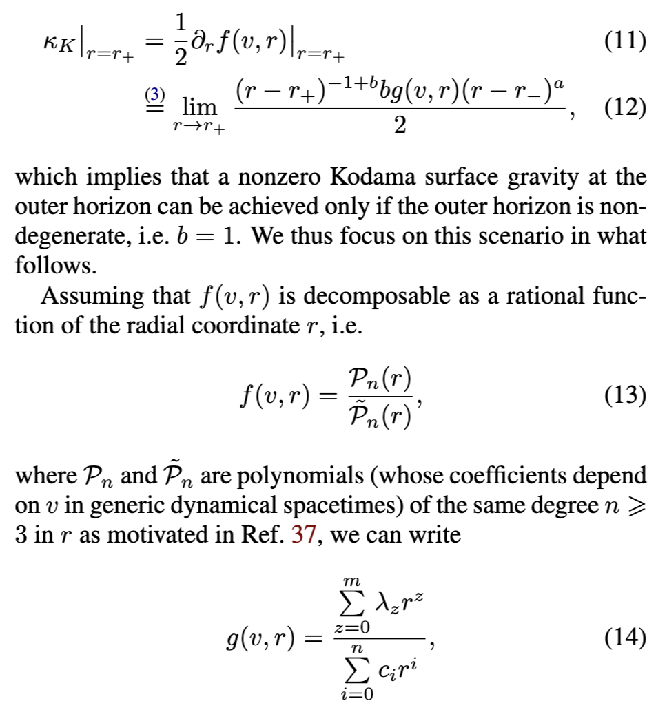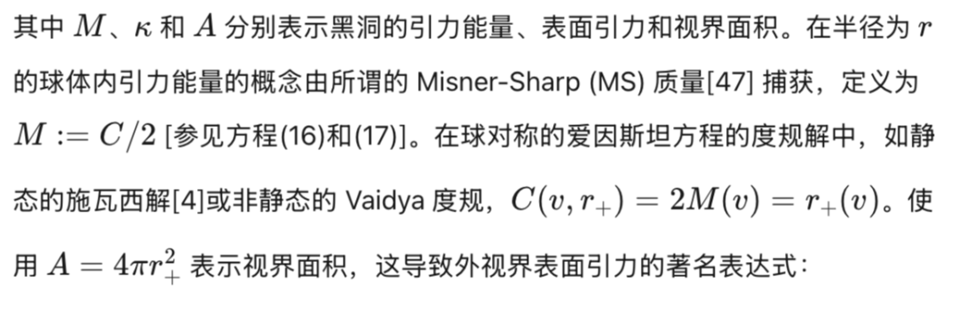 为了解决这一局限性并超越物理上不现实的静态场景,动态(因此是准局部的)视界的概念被发展出来[25–27]。它使我们能够描述一个演化中的黑洞时空的几何结构,并已成为准确模拟动态过程(如黑洞的形成和可能的蒸发)不可或缺的数学工具,同时也使得黑洞力学定律及其热力学解释的推广成为可能[25, 28],包括将表面引力视为温度参数。