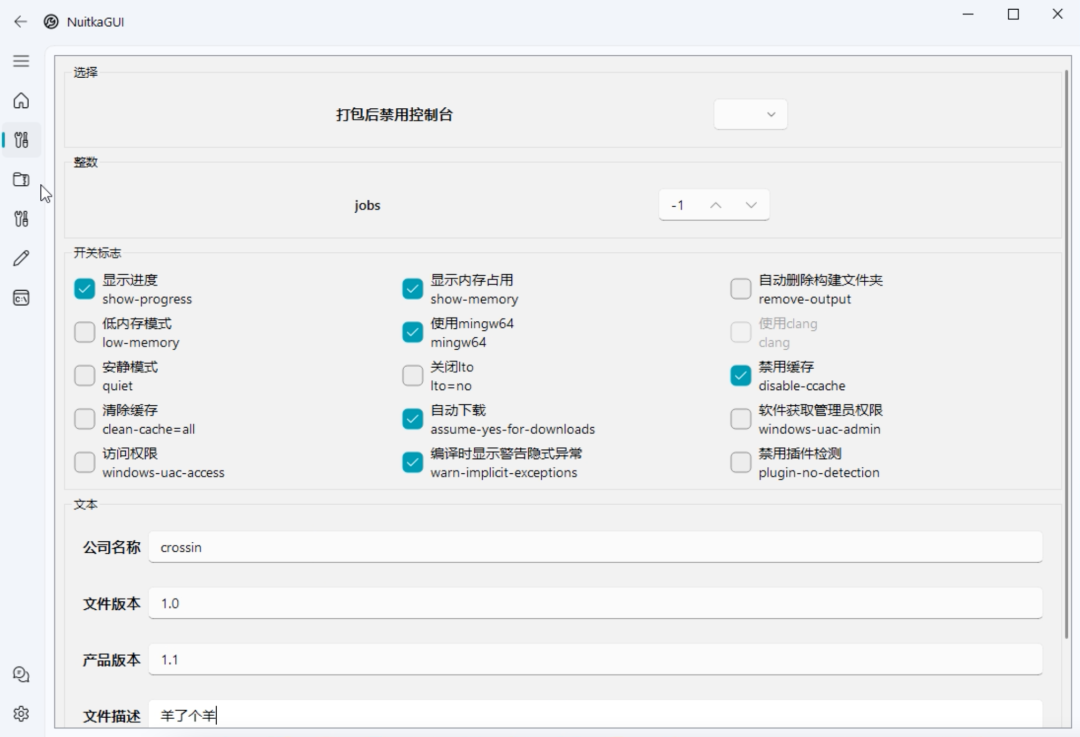 幸好,已经有大手子做了nuitka的辅助工具,比如这个NuitkaGUI,就可以让你通过可视化的选项,傻瓜式地设定打包参数,将nuitka的使用体验又拉高了一个档次。