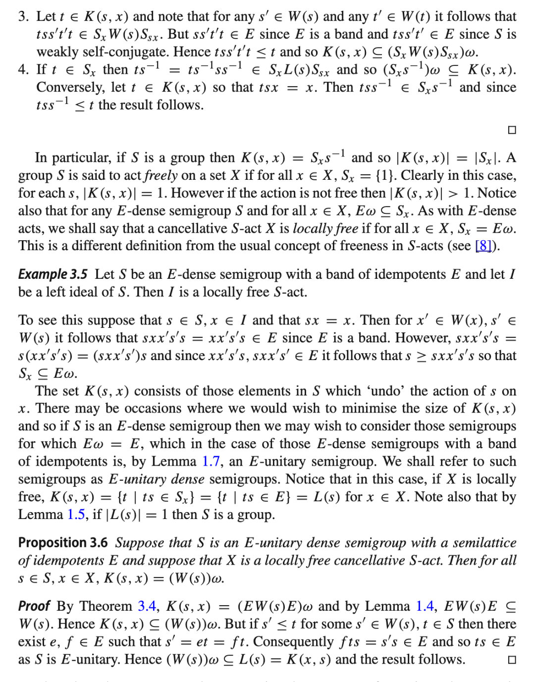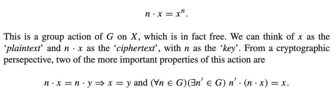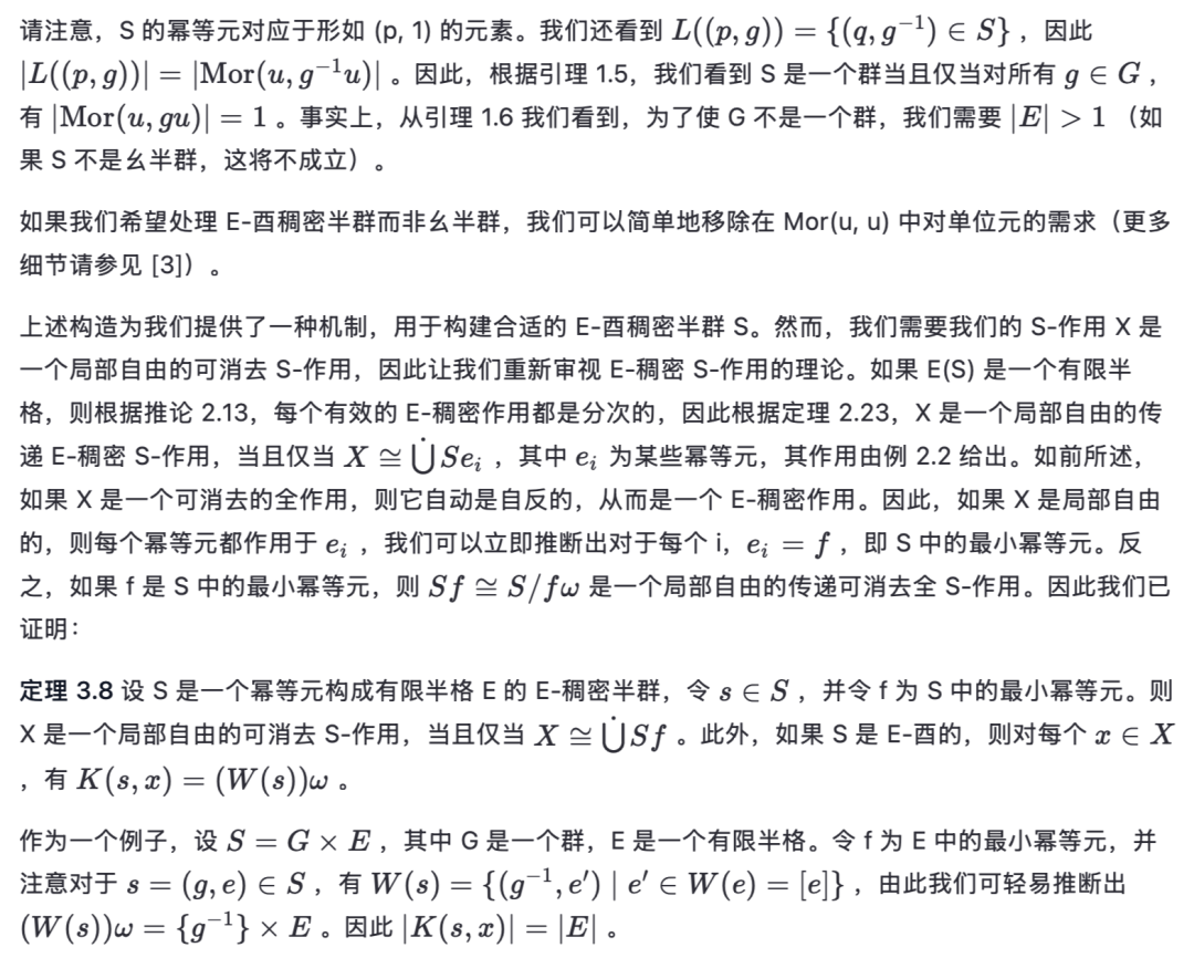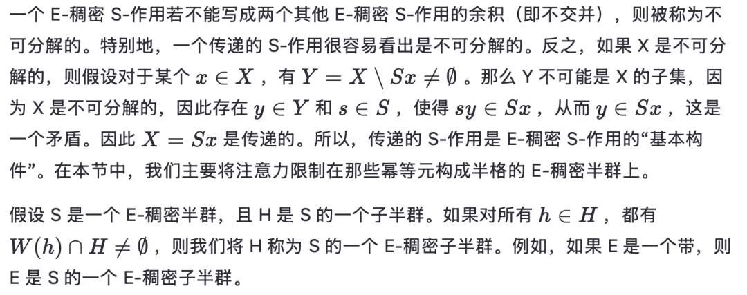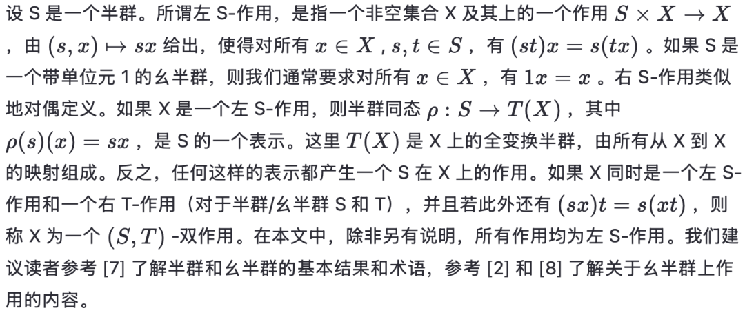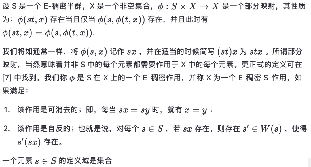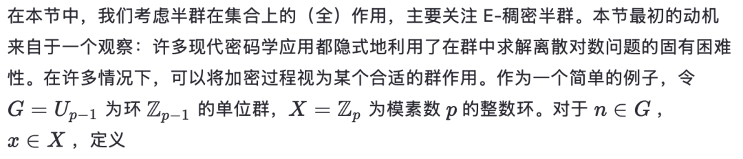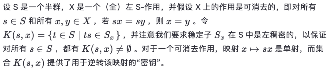 第一个性质说明“解密”是可行的,第二个性质说明我们可以使用相同类型的群作用进行解密,尽管可能使用一个不同的密钥。注意到这与 E-稠密半群的 E-稠密作用有明显的相似性,我们考虑为了将第 2 节的部分内容推广到全半群作用所需满足的条件。我们将看到,此类作用在密码学应用中的使用可能相当有限。