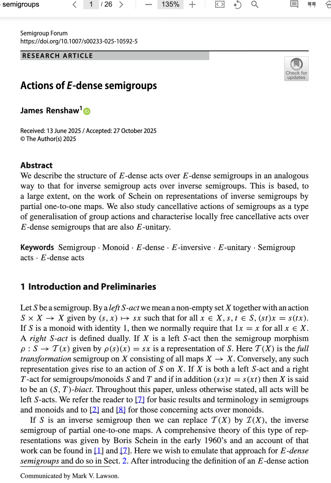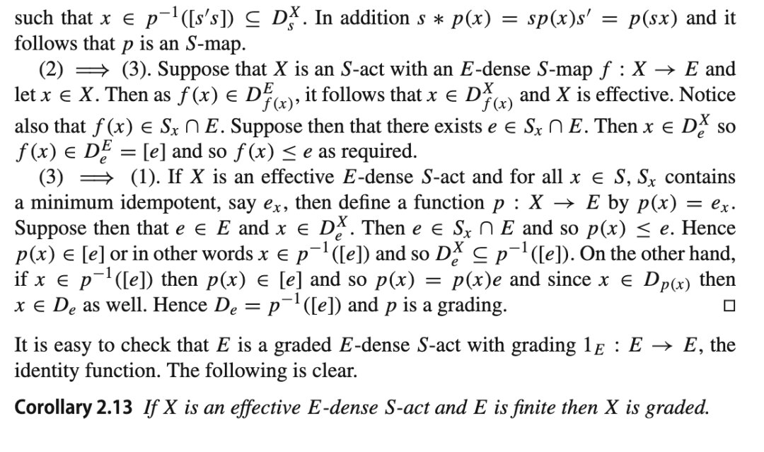 如果 S 是一个逆半群,那么我们可以用 I(X)替代 T(X),其中 I(X)是由部分一对一映射构成的逆半群。Boris Schein 在 20 世纪 60 年代初给出了这种表示的完整理论,相关工作的介绍可见 [1] 和 [7]。在这里,我们希望模仿这种方法来处理 E-稠密半群,并在第 2 节中实现这一点。在引入 E-稠密作用的定义并提供一些基本结果后,我们描述了 E-稠密半群上分次作用的结构。然后介绍了传递作用,并给出了此类作用的一个相当全面的结构。在第 3 节中,受群的离散对数问题在某些密码学应用中的启发,我们将这些结果应用于考虑可消去半群作用,特别是当 S 是一个 E-稠密且 E-酉半群时,考虑 E-稠密作用的结构。