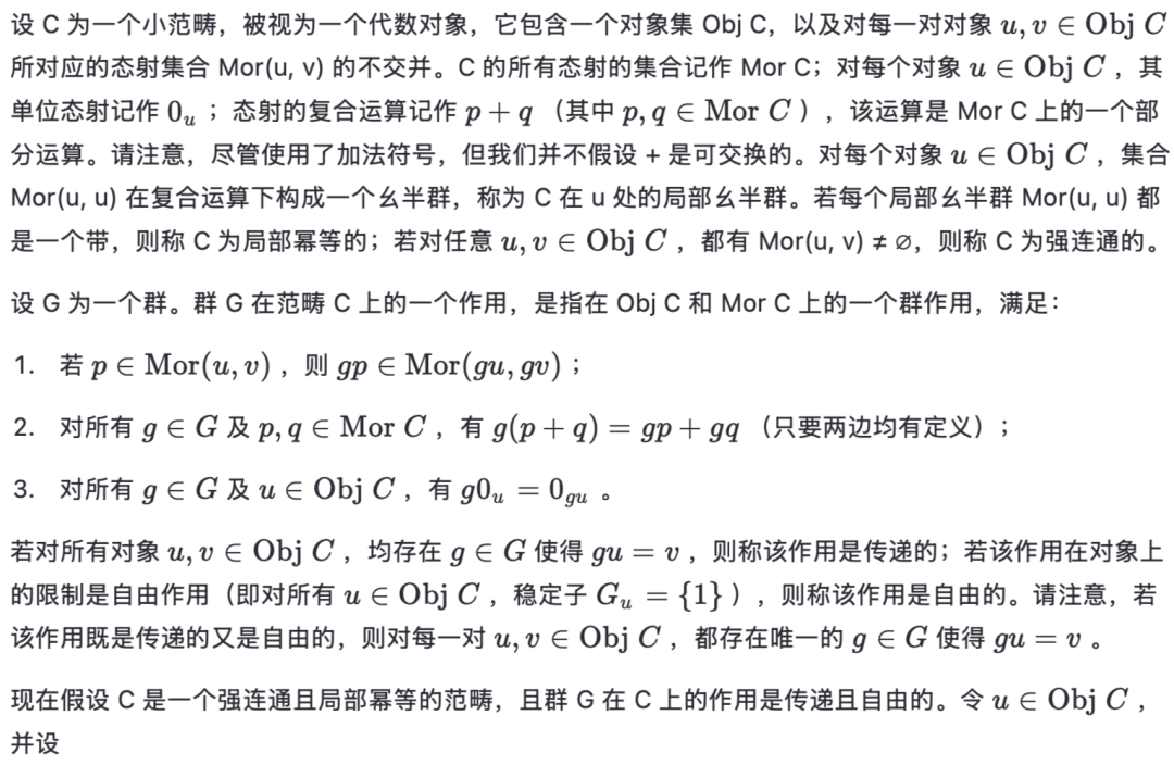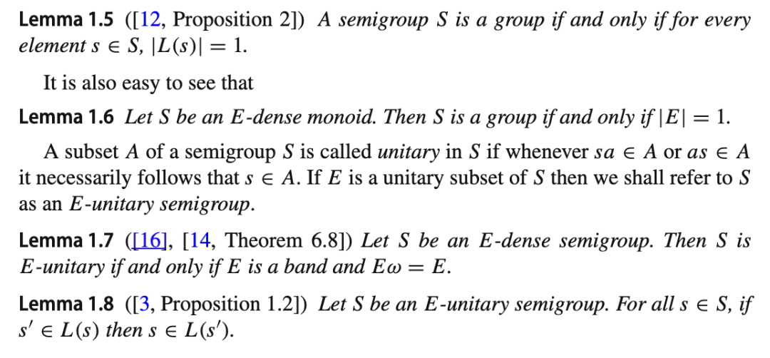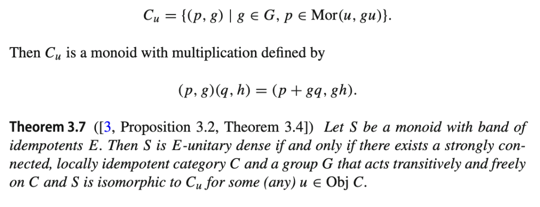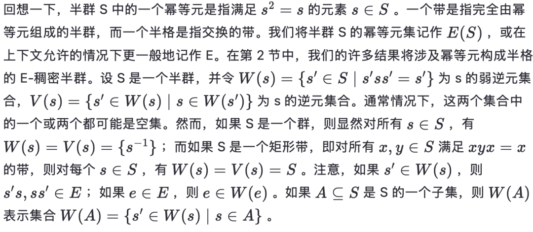 已有许多关于 E-酉稠密半群结构的研究成果,这些成果大多基于 McAlister 的著名工作([9]、[10]);本文在此呈现其中一种版本,最早见于文献 [3]。首先注意到:若 S 是一个半群,且 1S是通过向 S 添加单位元 1(无论 S 是否已含有单位元)所得到的幺半群,则 S 是一个 E-酉稠密半群,当且仅当 1S是一个 1-E-酉稠密幺半群。这一观察使我们可以在不失一般性的情况下,仅针对 E-酉稠密幺半群给出构造。本文在很大程度上沿用了文献 [4] 中的术语。