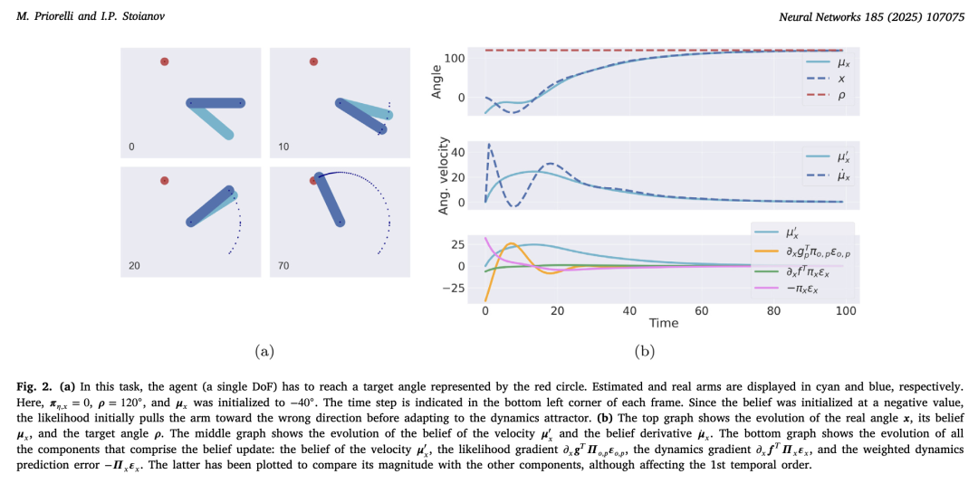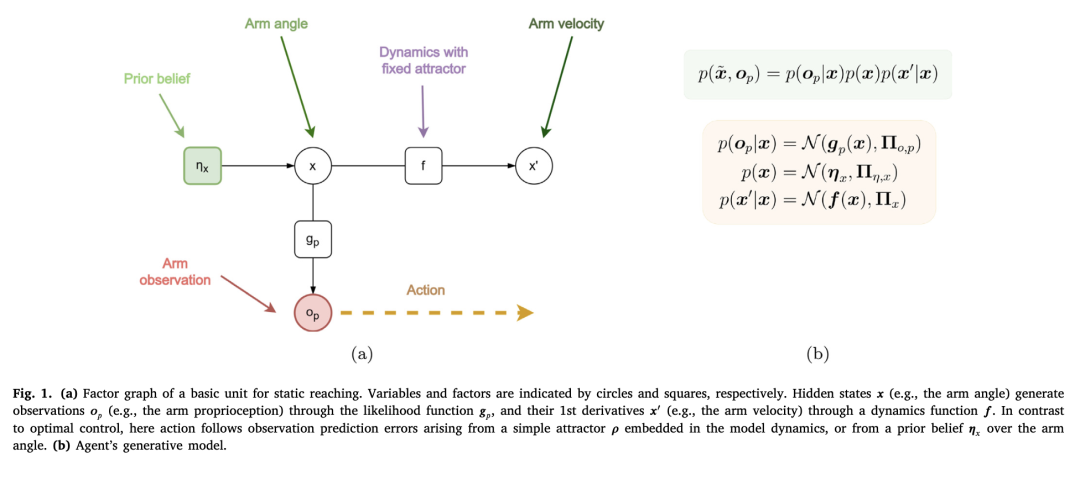 执行从本体感觉预测到运动命令 a 的逆动力学,可能由经典的脊髓反射弧实现。最后,行动也可以依赖于多个阶——速度、加速度等——允许更有效的运动和控制(Baioumy, Duckworth, Lacerda, & Hawes,2020;Bos, Meera, Benders, & Wisse,2022;Meera & Wisse,2021;Meo, Franzese, Pezzato, Spahn, & Lanillos,2023),但由于这超出了我们的范围,我们只最小化0阶。尽管如此,通过指定隐藏状态的适当动力学,仍然可以通过1阶运动——例如,保持恒定速度——来实现。