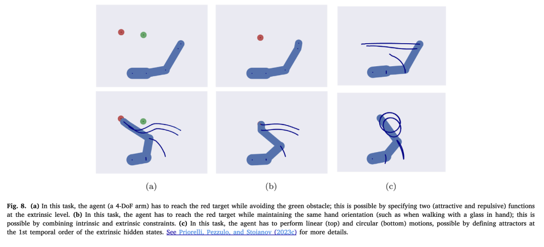 除了这种朴素策略之外,由于当前离散模型能够为每个IE模块(在内禀与外在域中)生成轨迹,一旦逆运动学被正确执行,便可实现更高级的行为——即为整个运动学链施加一条特定路径。这对应于具有两个(离散与连续)时间尺度的“垂直层级深度”,它引导低层推断朝某一方向进行,例如避开奇异点或摆脱由排斥吸引子产生的局部极小值。