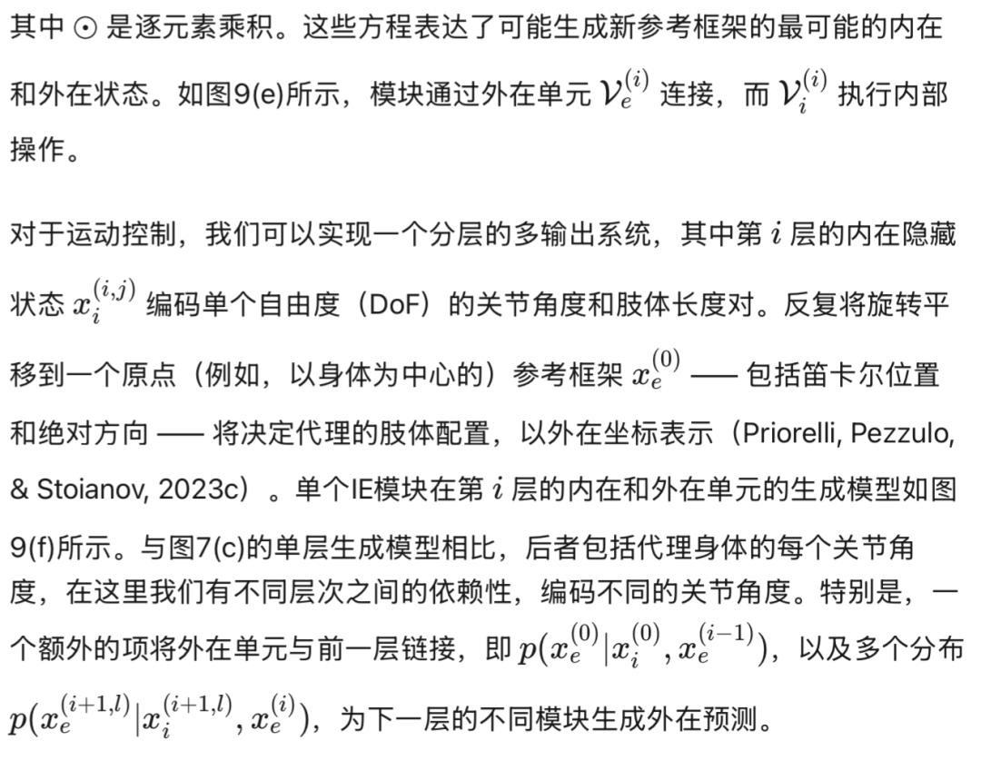 在描述图7(b)时,我们忽略了一个在开始时引入的关键机制:对物体可供性(affordances)的表征。回想一下,平行编码的隐藏状态不仅包括自我,还包括其他环境实体;然而,代理的模型现在可以分层地表达生成过程。这由以下似然函数描述: