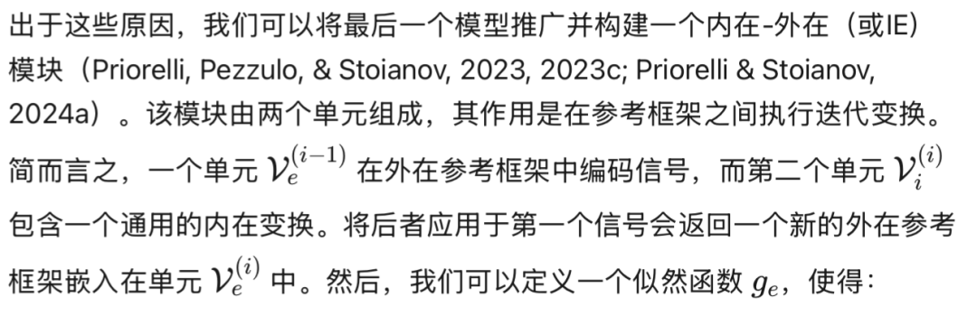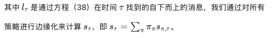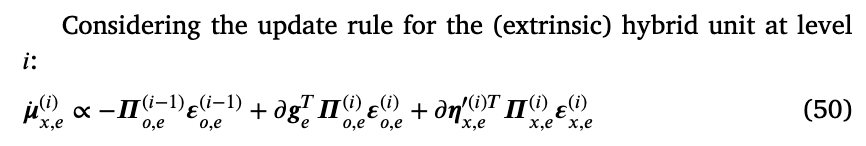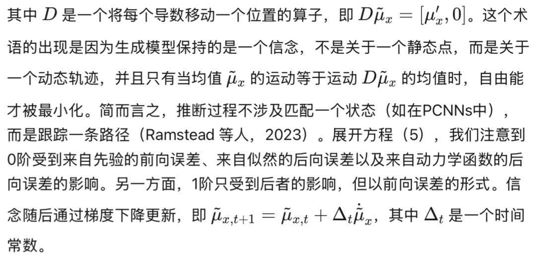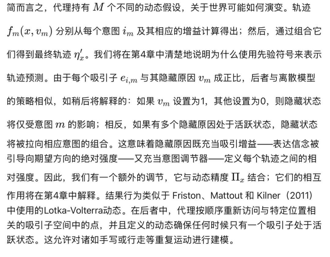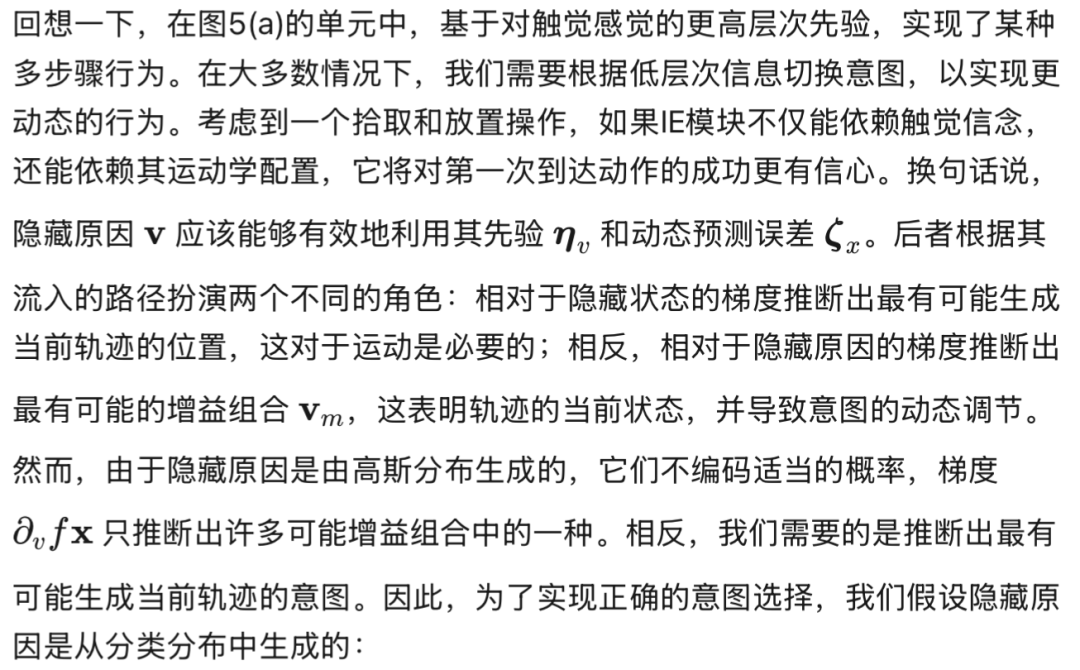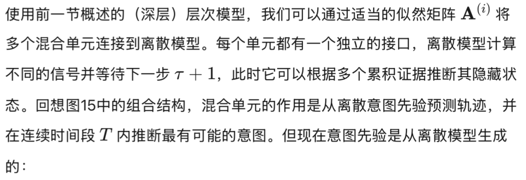 是方程(36)中轨迹先验的梯度,我们注意到前向和后向外在似然性之间以及离散模型的自上而下调节之间存在微妙的平衡。从离散模型的角度来看,离散隐藏状态为每个混合单元产生特定的隐藏原因组合;这种组合在连续域中生成复合轨迹,权衡不同的潜在轨迹,考虑到整个离散步骤 τ 的动态元素。在此之后,为每个混合单元积累证据,最终推断出可能生成与自我和环境相关的实际轨迹的最可能的离散状态。