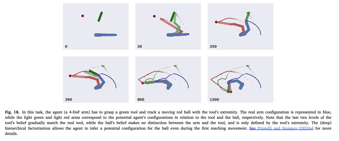 的信念中并不存在。然而,如果我们考虑这两种潜在配置,代理将工具视为其手臂的延伸,因此可以灵活地修改其身体图式,如介绍中所讨论的。这可以通过将工具的两个视觉观察与手臂和虚拟层次的隐藏状态的第二路径链接来实现,如图17所示。由于IE模块的内在单元还编码了关于肢体长度的信息,代理不仅可以通过视觉观察推断其运动学结构,还可以推断工具的实际长度(Priorelli & Stoianov, 2024b)。虽然这第二路径仍然以工具和手臂之间的明确区分为标志,因为手臂层次从两个元素接收观察,但构建了第三个路径,使得球的观察仅与虚拟层次相关联。因此,这种新的潜在配置将手臂和工具视为同一运动链的一部分。这三个路径之间的相互作用(如图18所示)可能揭示了随着广泛使用工具(Iriki 等人,1996;Obayashi 等人,2001),运动皮层的重新映射如何逐渐发生,修改了自我与环境之间的边界。
