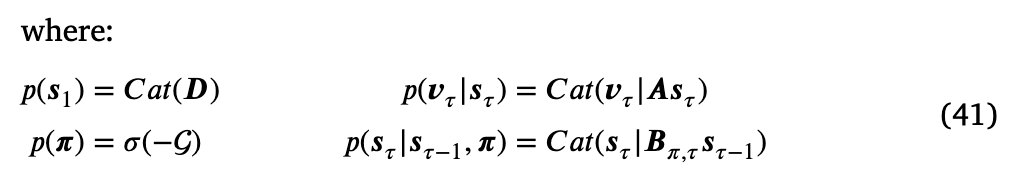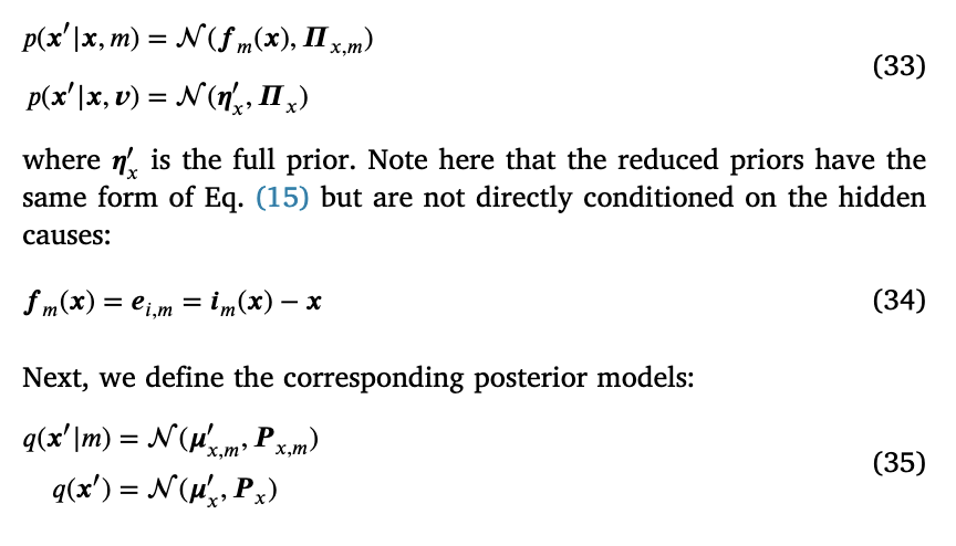 在传统的混合模型中,离散隐藏状态通过将特定简化先验与每个离散状态的概率加权来生成连续隐藏原因的先验;因此,简化先验代表了感觉器官真实原因的替代假设(Friston, Parr, & de Vries, 2017)。然后,隐藏原因的后验与这些简化先验进行比较,以找出其中哪一个可以是环境的最佳解释,同时考虑到在观察感觉证据之前它们的离散概率。因为代理比较的是预先固定和确定的连续替代方案,所以它无法在变化的环境中正确运行。例如,如果代理认为可以在两个位置中的一个找到物体,它将总是到达其中一个或另一个初始猜测,即使物体已经被移动到第三个位置。那么如何使用新可用的证据来更新我们的简化假设呢?通过将隐藏原因视为从分类分布生成的——如方程(31)——我们可以将隐藏状态的后验与动态函数