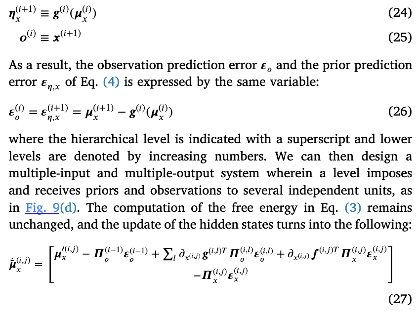 在层级主动推理模型中,单元按层排列,使得某一层的输出作为其下层的输入。这种架构能够表征复杂数据,例如卷积模型或非线性时间序列(Friston, 2008)。在运动控制领域,一个(深层)目标层级整合了大脑的控制与动机通路(Pezzulo, Rigoli, & Friston, 2018)。对于机器人学而言,可设计连续时间下的层级运动学模型,其中每个单元在内禀参考系与外在参考系中编码特定的自由度(Degree of Freedom, DoF)(Priorelli, Pezzulo, & Stoianov, 2023c)。这使得实现涉及多个肢体同步协调的高级动作成为可能,例如手持玻璃杯行走。该层级结构还可推广用于不同参考系间的齐次变换,例如透视投影(Priorelli, Pezzulo, & Stoianov, 2023)。