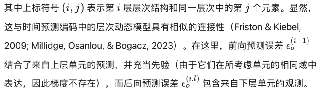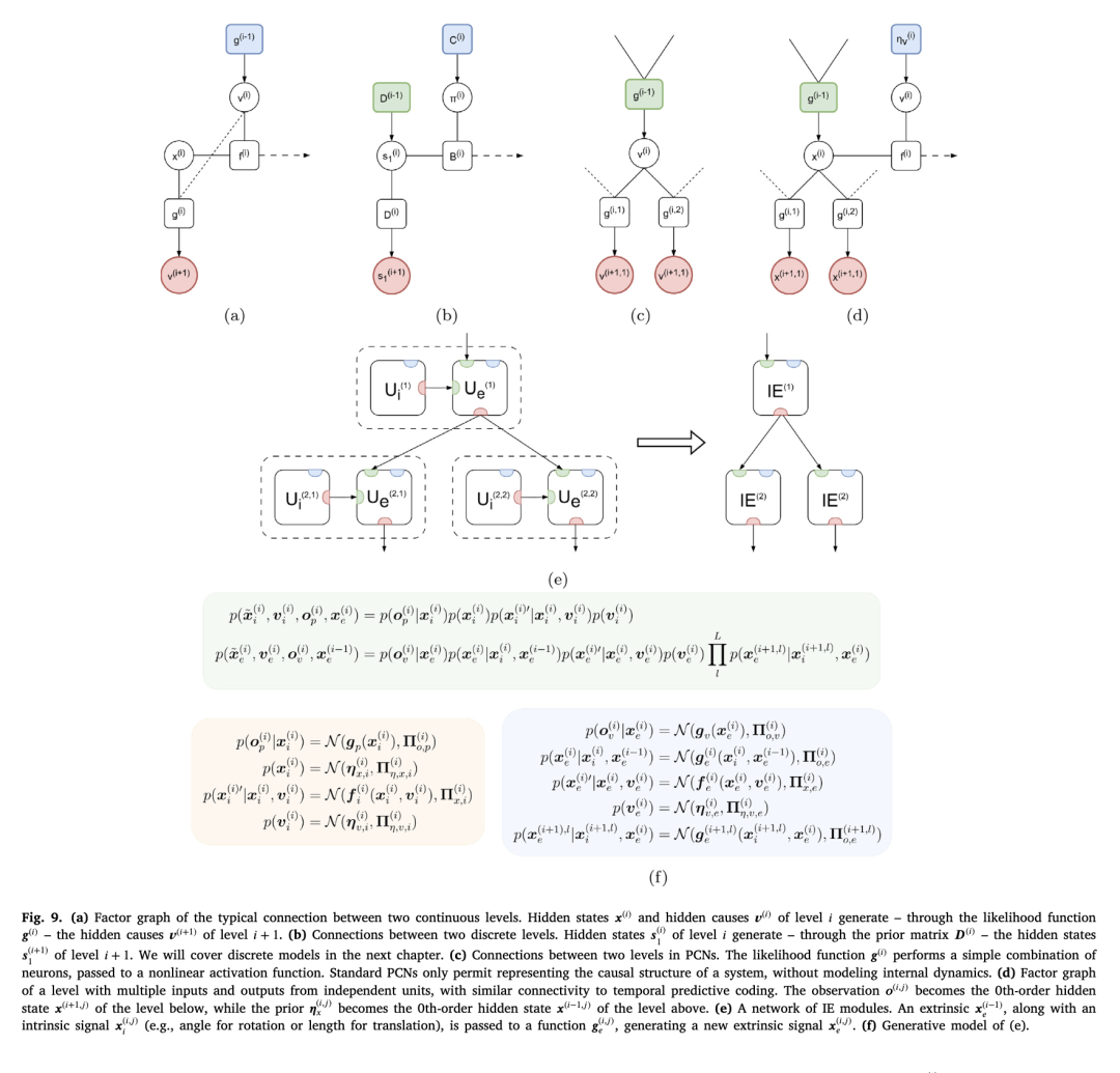 图7(b)中的模型引入了两个层级(内禀与外在)之间的层级依赖关系,这种依赖通过连接隐状态实现。相比之下,连续时间主动推理中的典型方法是:将某一层级的隐状态与隐原因,与下一层级的隐原因(而非隐状态)相连接,如图9(a)所示。虽然这种方法允许为下层单元施加一条轨迹,但要为第0阶隐状态指定固定的设定点(setpoints)却并非易事,因为由隐原因产生的动力学预测误差必须回传至前一个时间阶次。从图7(b)可清晰看出,在设计层级模型时,隐状态之间的连接具有极高的实用价值。事实上——如图9(b)所示——它在离散模型中定义不同时间尺度的初始状态时至关重要,例如用于象形文字阅读(Friston et al., 2020)或语言交流(Friston et al., 2020)。类似连接也应用于标准的预测编码网络(PCNs)中,其中每一层的每个神经元计算上一层神经元的组合,并将其传递给激活函数(Millidge, Seth, & Buckley, 2022)——如图9(c)所示。