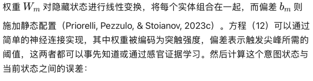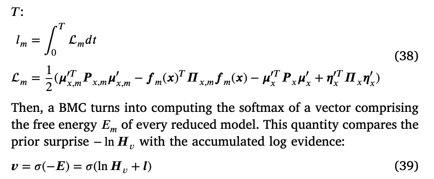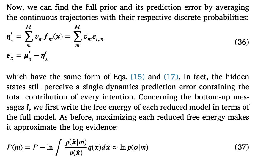 其中 l = [l₁, ..., lₘ]。关于在拉普拉斯假设下BMC的完整推导,请参见Friston等人(2018)、Friston和Penny(2011);关于本文所提方法的更多细节,可参见Priorelli和Stoianov(2023a)。公式(39)是公式(9)的离散对应形式,但此时自底向上的消息编码了一个恰当的离散分布,可用于推断与当前轨迹最相关的意图。