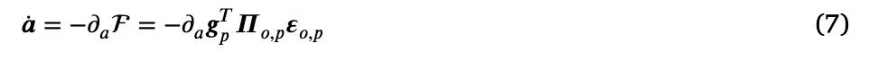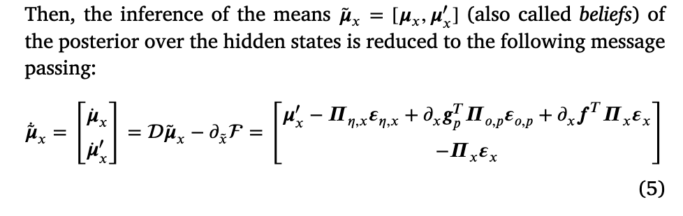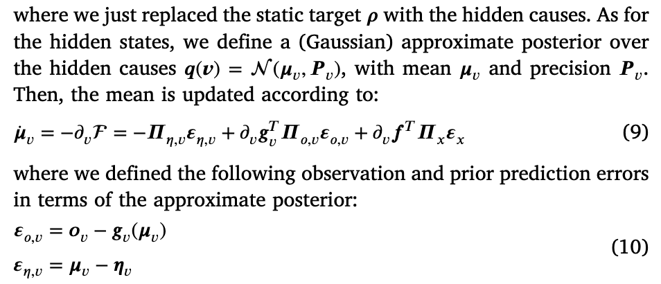 。由于这些预测误差是从代理的信念中产生的,这意味着每当后者偏向于某个首选状态时,运动就会自然跟随。因此,在感知和行动之间存在一个微妙的平衡——在感知中,预测误差在层次结构中上升,以使信念更接近观测——而在行动中,预测误差在较低水平上被抑制,因为观测更接近它们的预测。然而,关于如何在连续时间内实际实现主动推理,仍有一个未解决的问题。一些研究表明,直接使用外感受信息来计算运动命令可以导致更平滑的运动和解决视动冲突(Friston, Daunizeau, 等人,2010;Maselli 等人,2022;Priorelli & Stoianov,2023b),实际上一些机器人实现有效地使用了这种方法(Oliver 等人,2021;Sancaktar 等人,2020)。然而,证据似乎表明运动命令仅通过抑制本体感觉信号产生(Adams, Shipp, & Friston,2013;Friston,2011),这已经是运动所需的内在参考框架,因此导致更容易的逆动力学。出于这个原因,在接下来的内容中,我们假设运动是通过最小化相对于本体感觉预测误差的自由能来实现的: