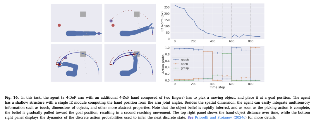 除了之前的代理,现在可以同步不同连续信号的行为,基于相同的高层次策略。例如,可以实现与移动物体的拾取和放置操作——如图16所示——在到达和抓取动作之间产生平滑的过渡,分别在外在和内在领域执行(Priorelli & Stoianov, 2024c)。注意这两个动作之间如何自然地出现中间阶段,对应于复合接近运动。原则上,动力学精度