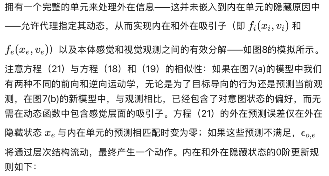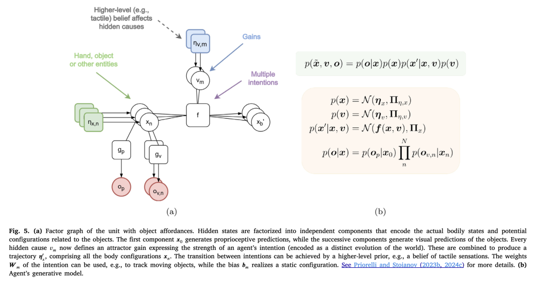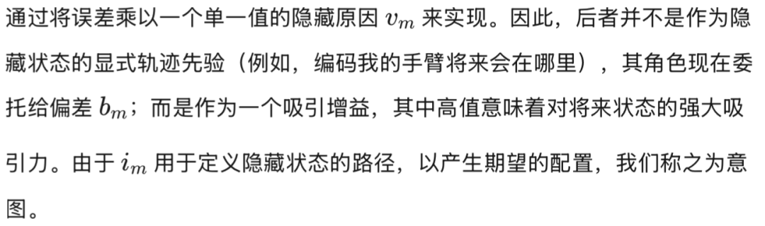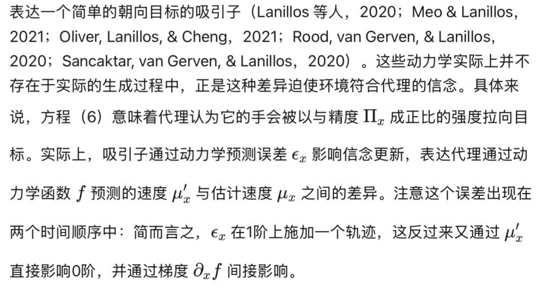 公式(14)中的动力学函数并非像似然函数那样由分离的通路构成,而是同时影响所有环境实体——例如,它会根据目标计算出一条手臂的运动轨迹。智能体在执行伸手动作时所经历的步骤如下:(i) 第0阶状态为第1阶状态施加一条轨迹,并生成感觉预测;(ii) 第0阶状态推断其自身预测的后果,因此此时它既受到意图状态的影响,也受到观测值的影响(即被二者共同偏置);(iii) 从这一新的偏置位置生成本体感觉预测,最终驱动动作产生。