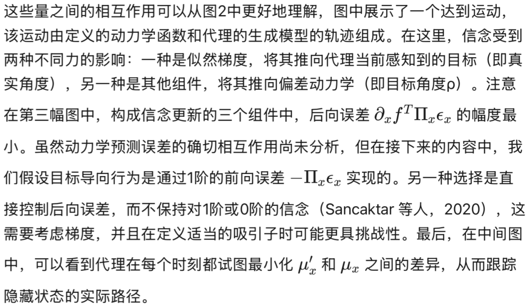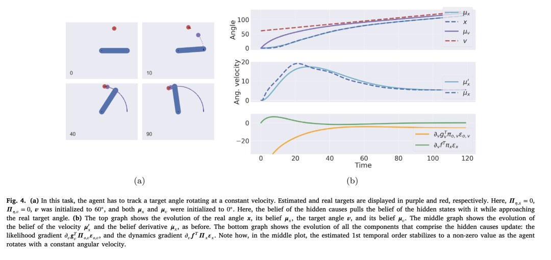 显然,隐藏原因会受到先验预测误差、反向动力学误差和反向似然误差的影响——这与隐状态的更新类似,不同之处在于该推断作用于一个状态而非一条路径。通过反向似然误差,智能体可以在移动时正确估计目标构型,如图4的追踪模拟所示。关于动力学预测误差,它现在可以流入两个不同的通路:具体而言,梯度 ∂ₓ𝒇 和 ∂ᵥ𝒇 的作用分别是推断产生特定速度的状态与原因;它们的实际作用将在第4章中阐明。