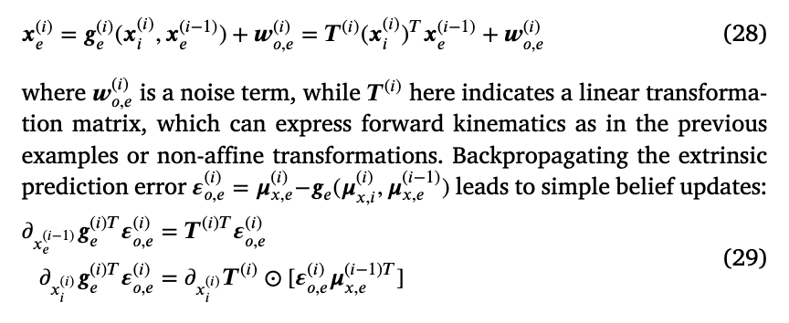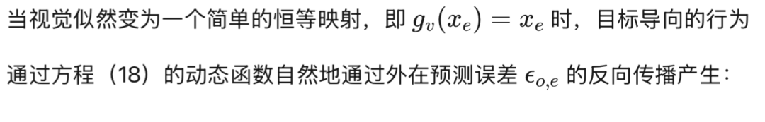 视觉似然函数 𝒈𝑣 分别通过前向运动学和恒等映射,生成对手部与目标的视觉预测。对于目标导向的行为,首先生成目标位置与手部位置之间的误差;随后,一个逆运动学模型被直接嵌入动力学函数中,例如采用雅可比转置或伪逆(Friston, Daunizeau, et al., 2010;Friston et al., 2011;Lanillos et al., 2020;Meo & Lanillos, 2021;Oliver et al., 2021;Pio-Lopez et al., 2016;Sancaktar et al., 2020)。换言之,外在参考系被反转以生成一个内禀状态,该状态随后再次转换回原始域,以便与视觉观测值进行比较。因此,前向运动学与逆运动学各执行两次:一次在动力学函数中,另一次在视觉推断的前向与反向传递过程中——即当视觉预测误差