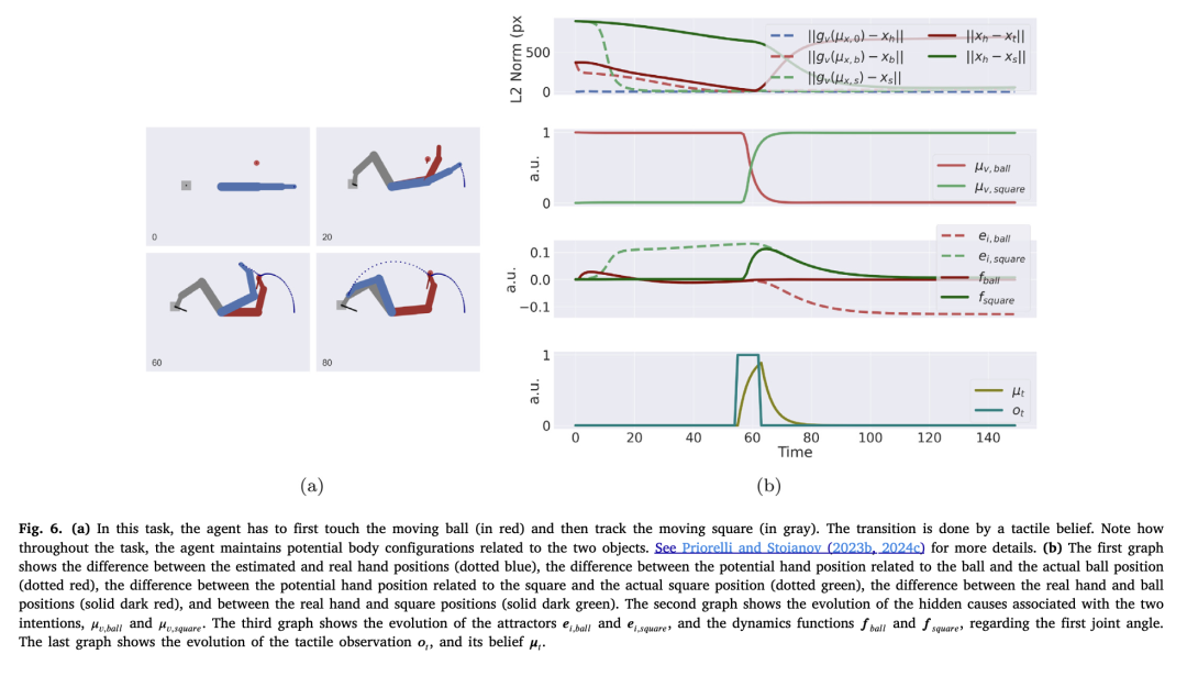 该方法实现了智能体对当前情境所预测的平均轨迹。此方法之所以有效,原因有二: 第一,它允许将复合运动分解为若干更简单的子目标,这些子目标可被分别处理;例如,当智能体面临两个或多个相互冲突的先验时,这种方法有助于分析其行为(Priorelli & Stoianov, 2023b)。 第二,无需规划即可实现简单的多步行为(Priorelli & Stoianov, 2024c),此时仅需调整隐藏原因即可。连续轨迹之间的转换则可通过更高层级的先验实现,例如触觉感知的信念。 第三,也是最重要的一点,它允许并行维持与待操控物体相关的潜在身体构型——从而实现运动间的高效过渡——并根据物体的可供性及智能体的意图对物体进行编码(例如,用手柄抓握杯子,或用整只手抓握)。图6的模拟展示了这一特性,其中智能体执行一项包含移动物体的两步伸手任务。