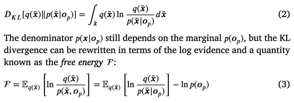 但是代理在实践中是如何移动的呢?如介绍中提到的,行动是自由能原则的另一面,通过该原则,代理采样那些符合其先验信念的观测。实际上,除了感知推理(预测编码中的典型)之外,主动推理还假设生物体通过与环境的互动来最小化自由能;这种最小化简化为一个更简单的更新,仅依赖于(本体感觉)预测误差